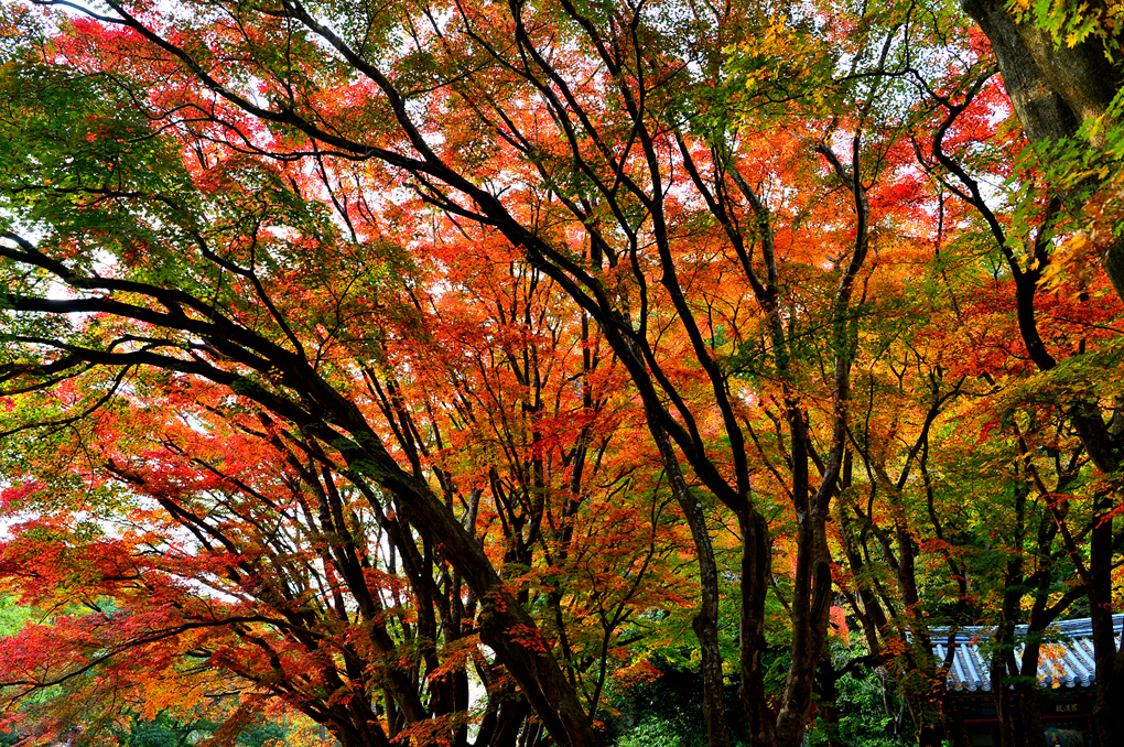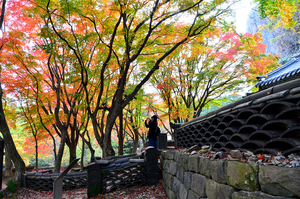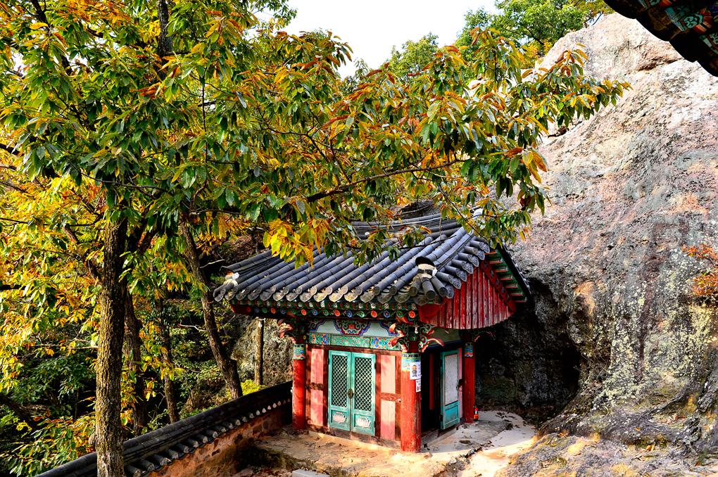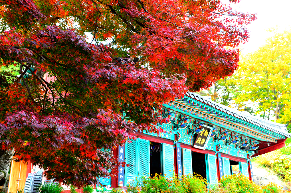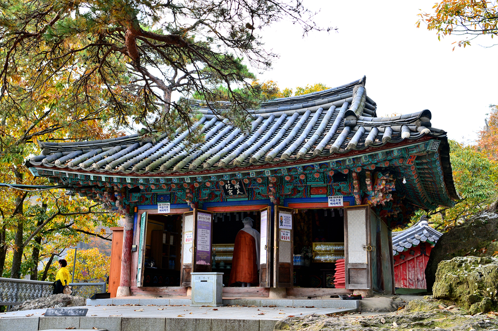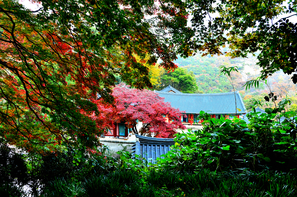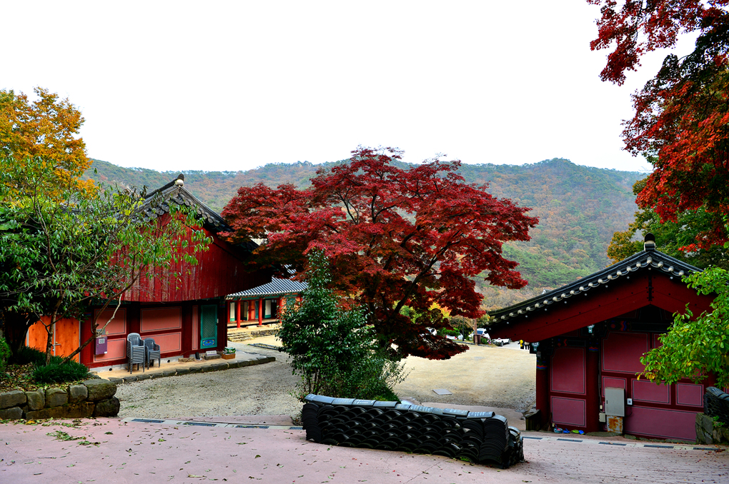 사찰의 지붕 너머로는 깊어가는 선운산의 아름다운 단풍 숲이 바라보인다.