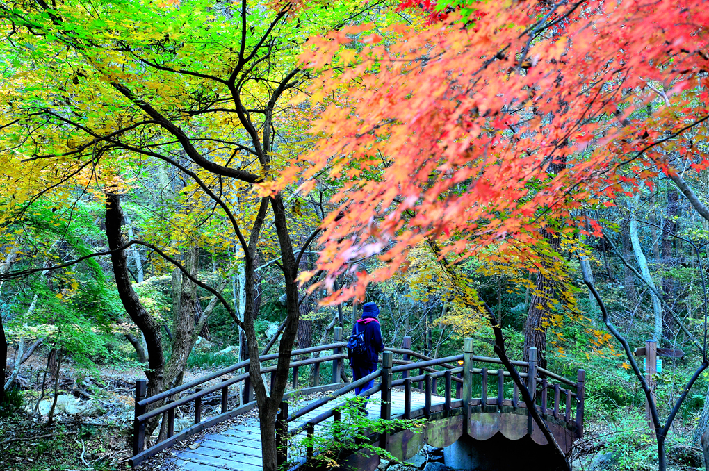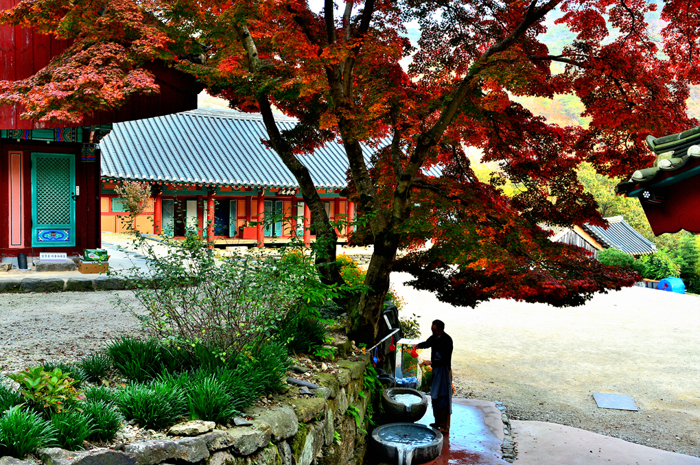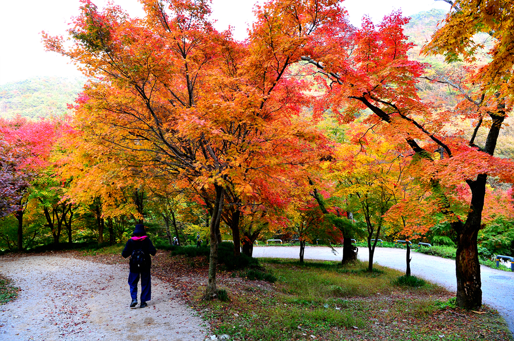 극락보전으로 오르는 입구의 화사한 단풍의 배웅을 받으며 하산 길에 오른다.