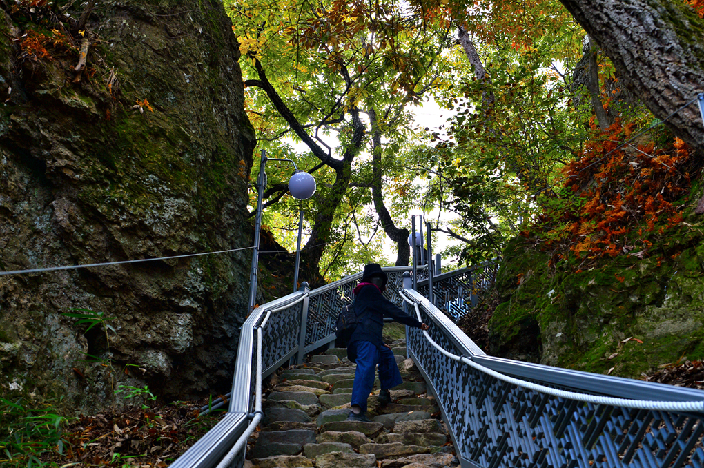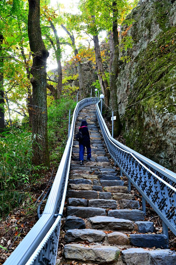 험준한 바위산 옆으로 나있는 도솔암으로 오르는 돌계단이 무척 가파르다.