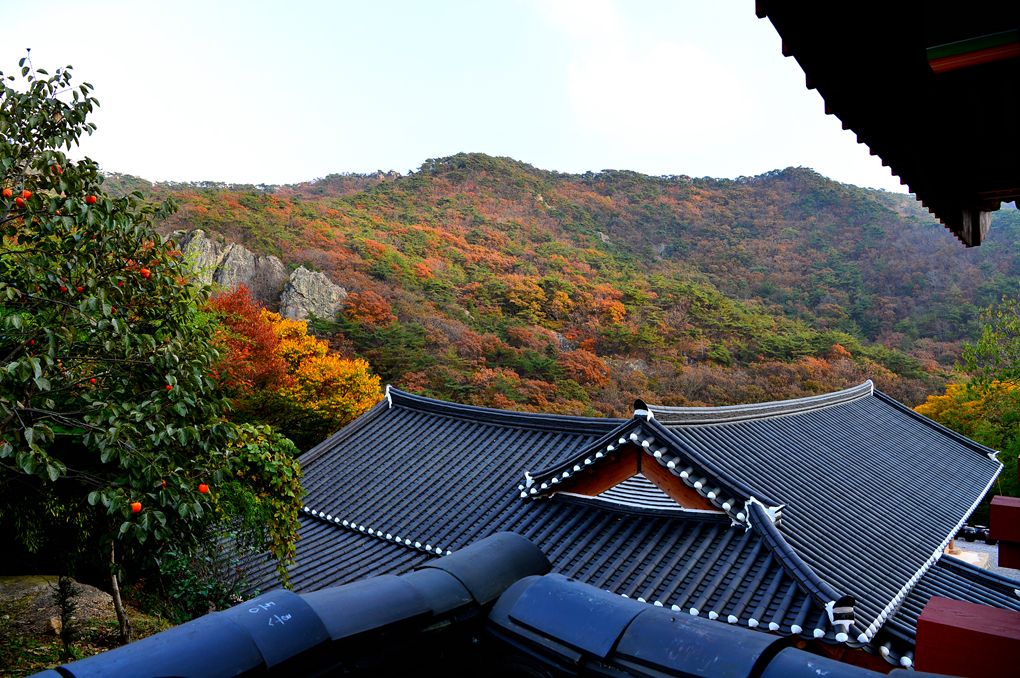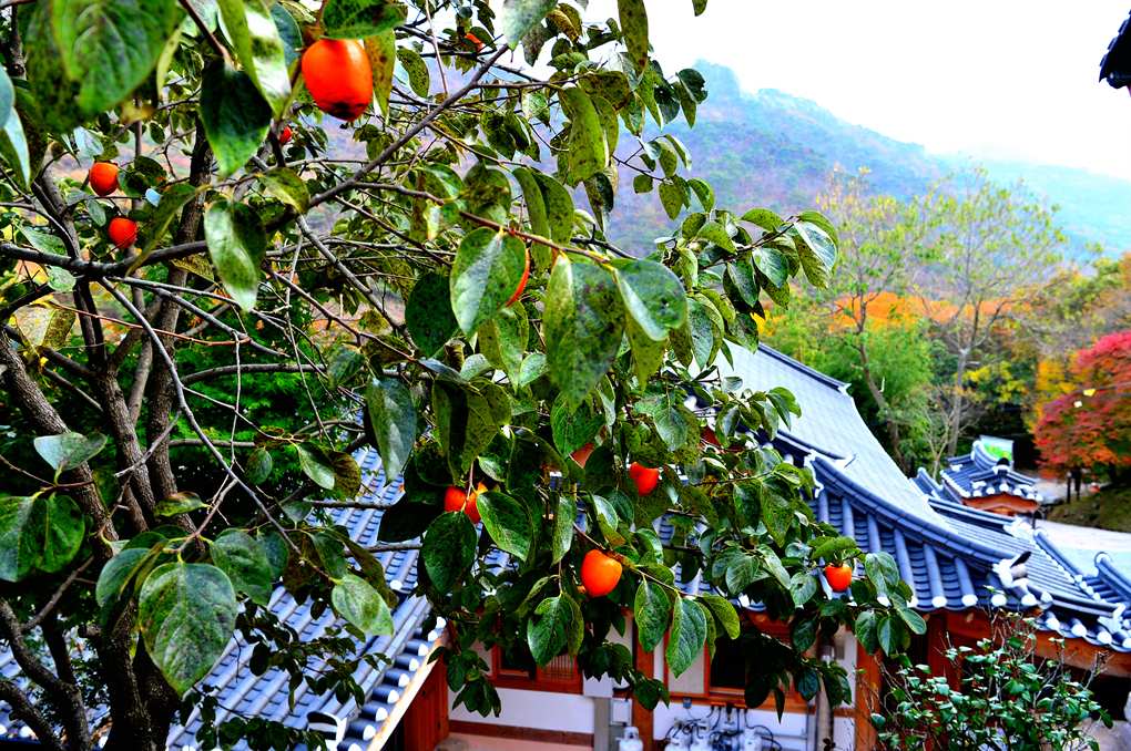사찰 건물 위의 잘 익은 감들이 가을 정취를 더해 준다.