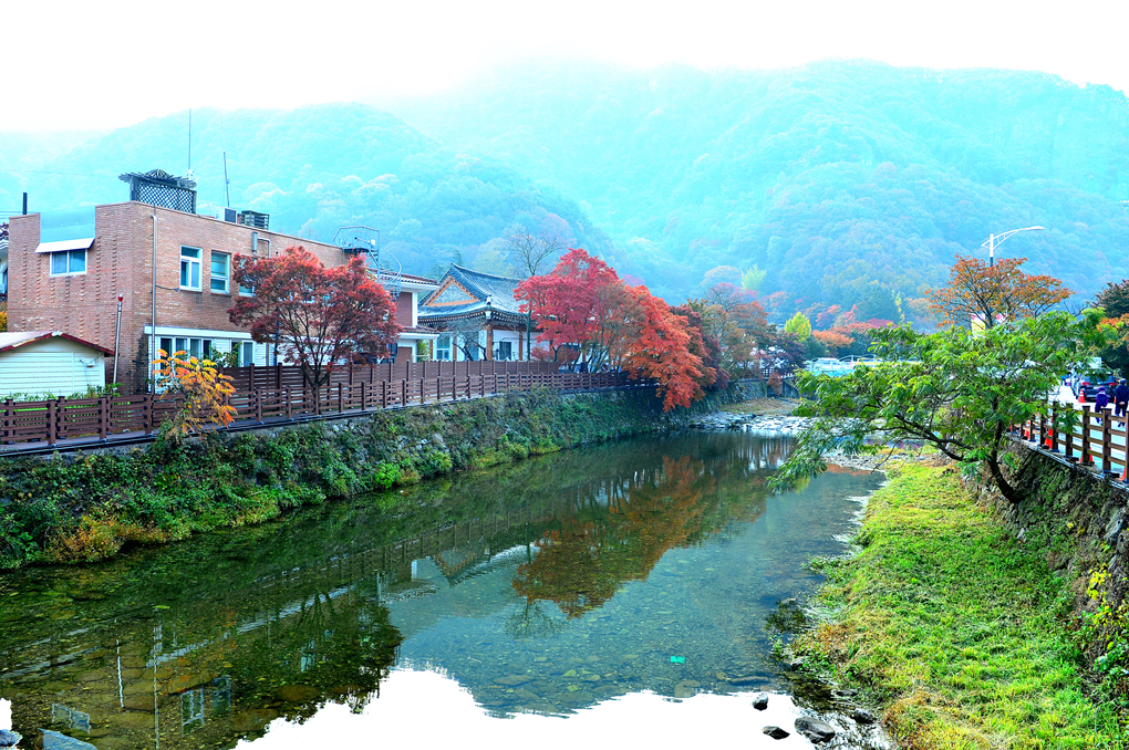 상가 지역 앞을 흐르는 천변에도 단풍이 곱게 내려앉아 있다.