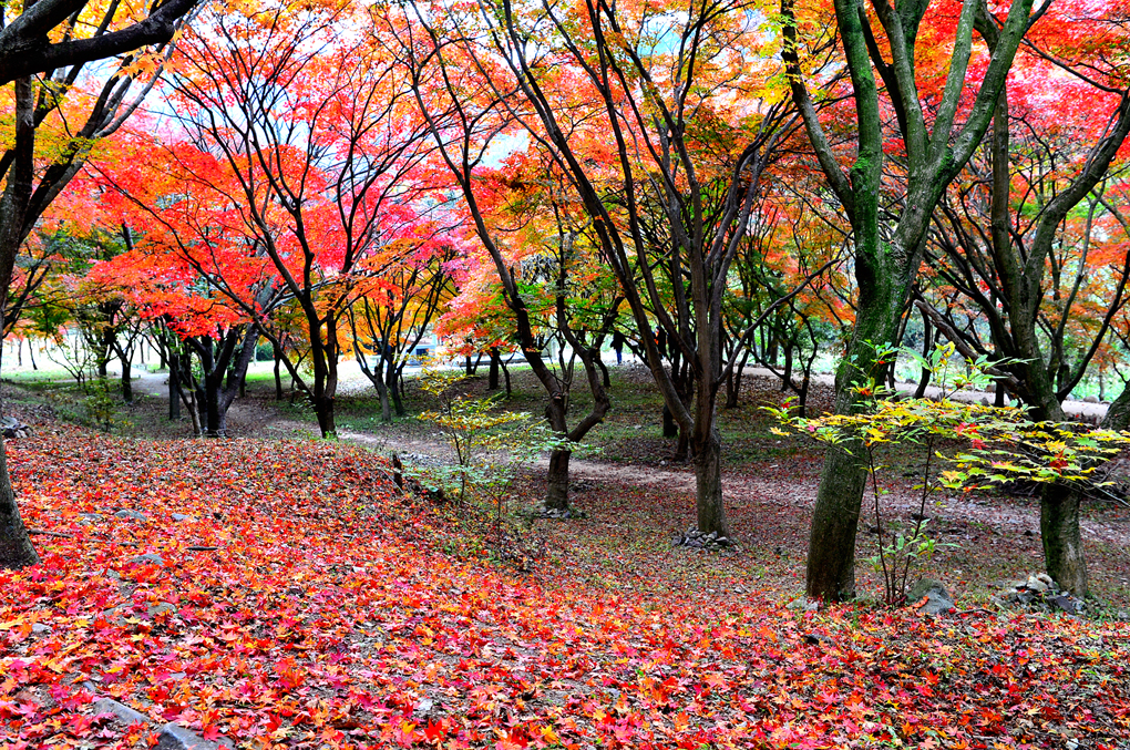 바닥에 떨어진 빨간 단풍들이 꽃길을 만들어 주고 있다.