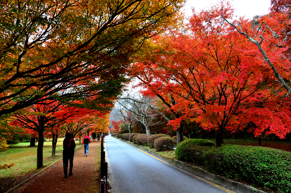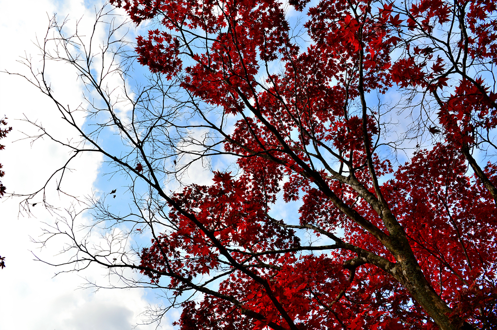 고목에서 쏟아져 나온 빨간 단풍이 도로 위까지 차고 넘친다.