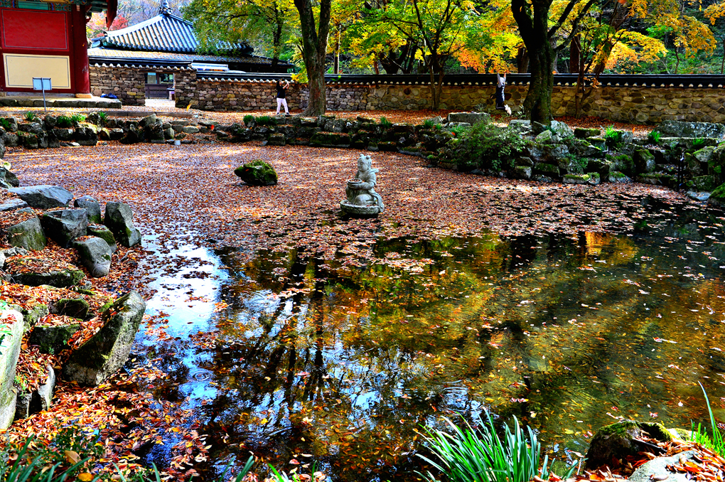 정혜루 밖의 연지에는 가을 낙엽이 수북이 쌓여 있다.