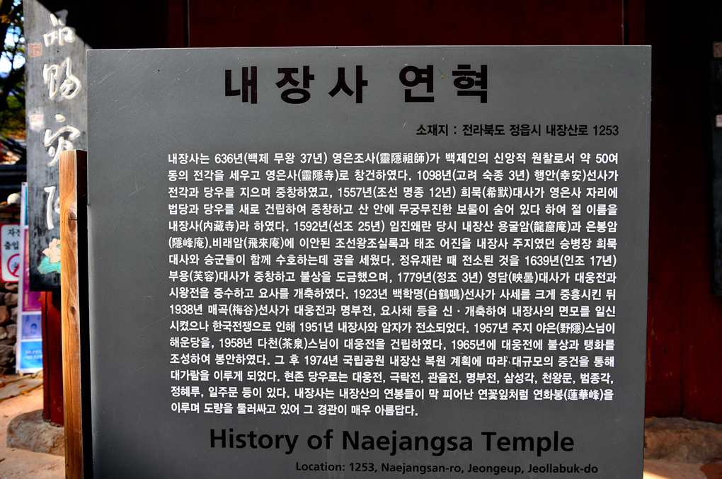 천왕문 밖에 세워놓은 안내판에서 내장사의 연혁을 살펴봤다.