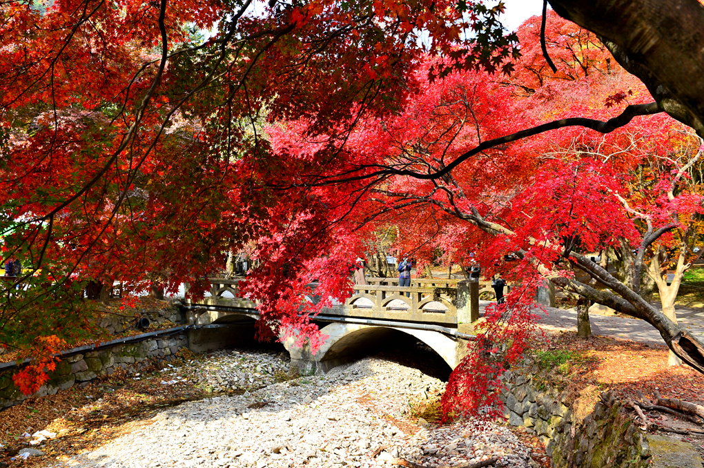 아름다운 단풍 사이의 실록교를 건넌다.