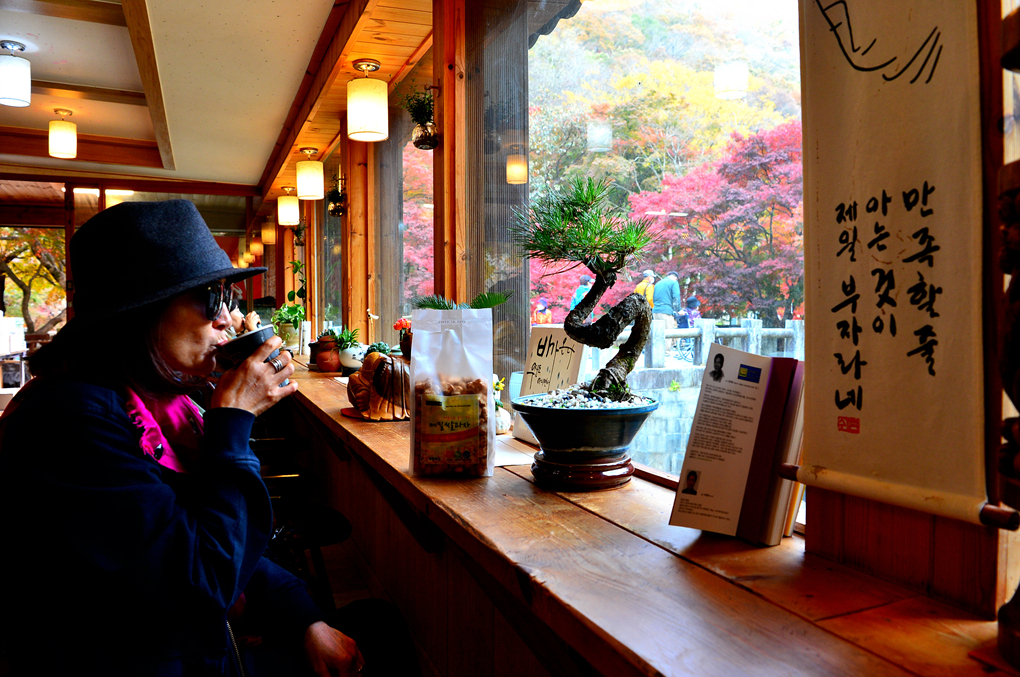 찻집 앞의 석교에도 빨간 단풍이 곱게 내려앉았다.