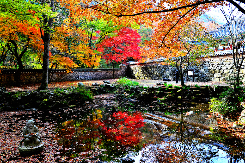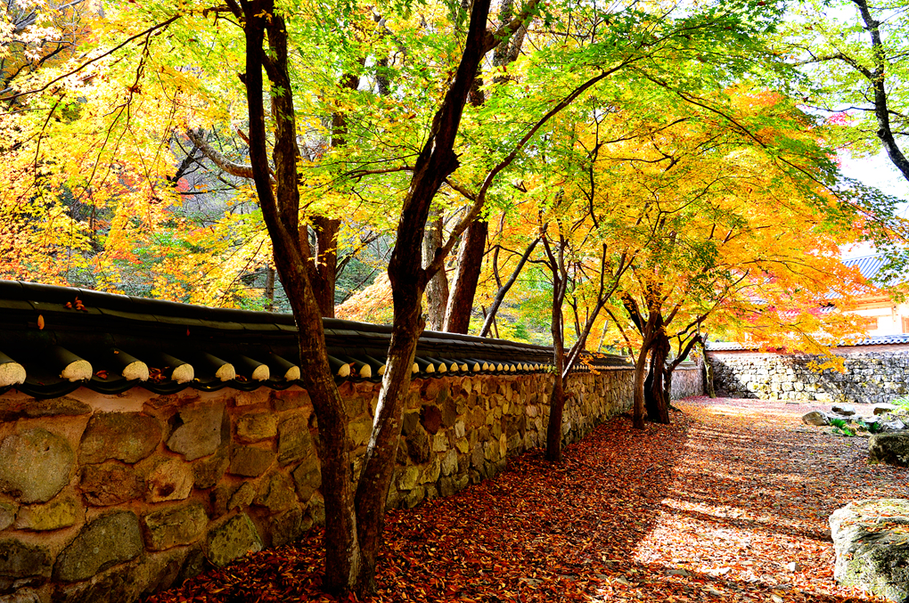 연지와 담장 사이의 낙엽과 단풍 모습이다.