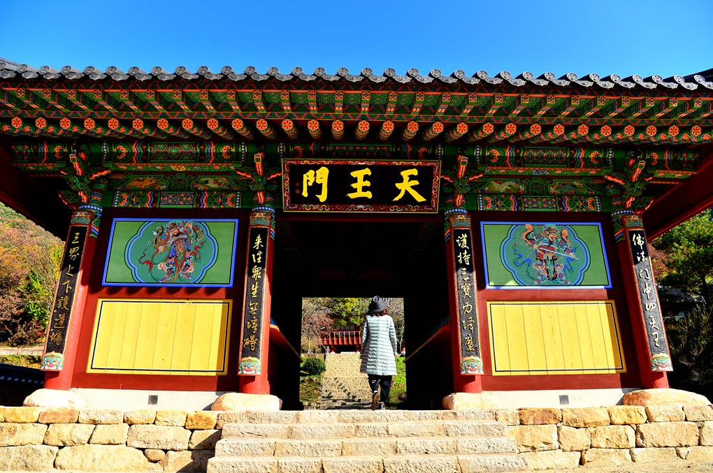 천왕문에서 바라본 대적광전 앞의 삼홍루 모습이다.