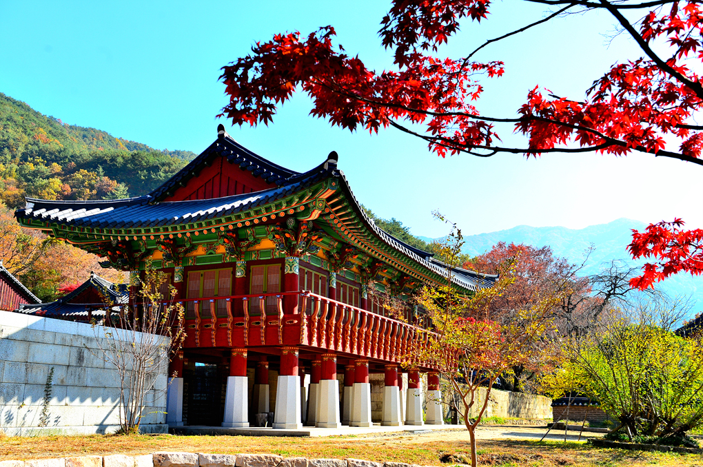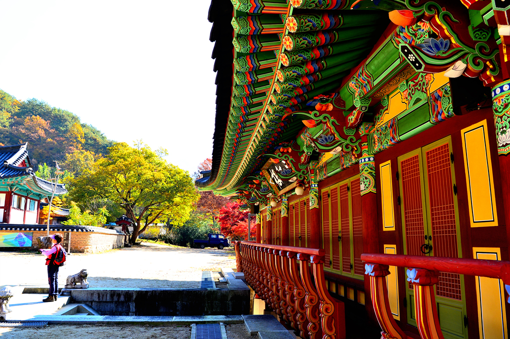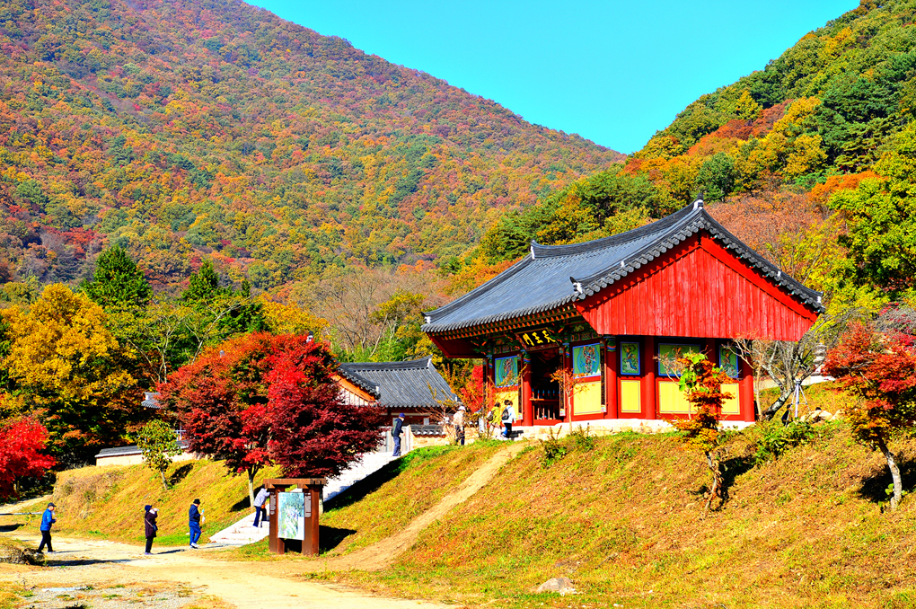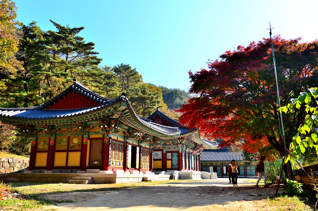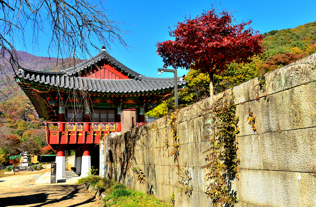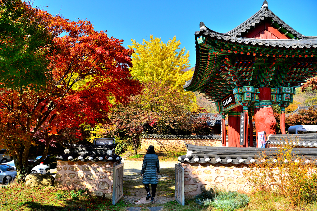 아름다운 단풍으로 물든 지리산을 배경으로 서있는 천왕문 안으로 제법 많은 탐방객의 발걸음이 이어진다.