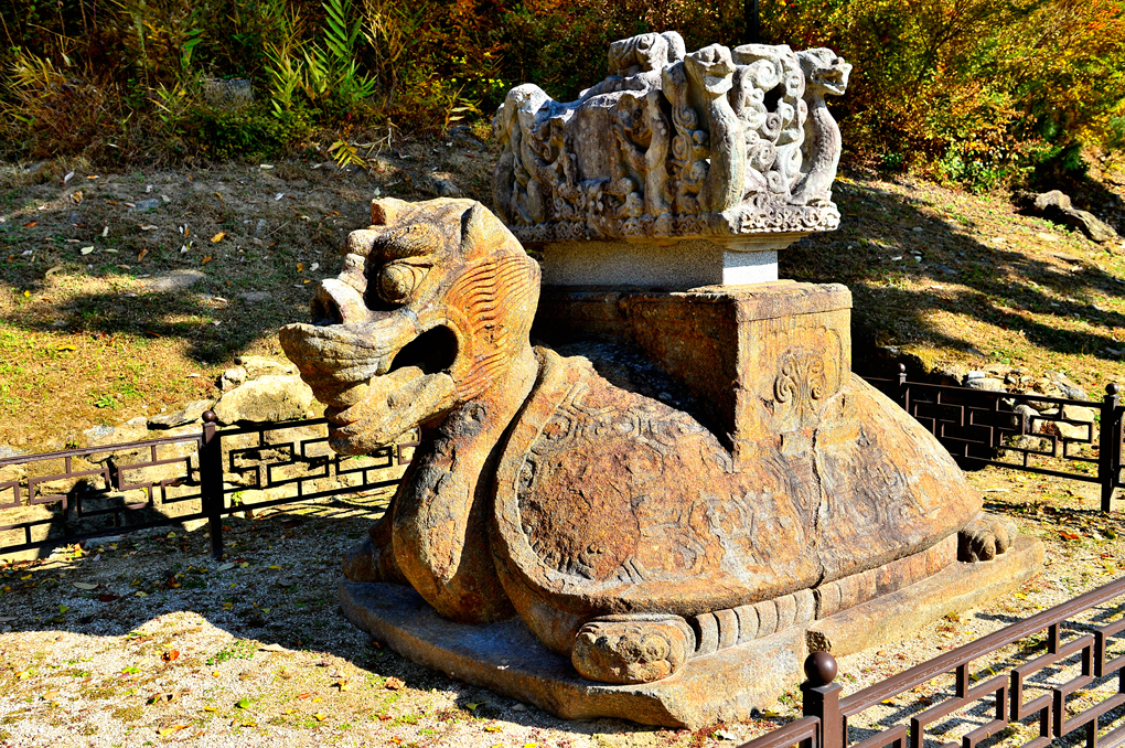 비석을 받치고 있는 돌 거북의 머리가 용의 머리를 하고 있는 것이 무척 인상적이다.