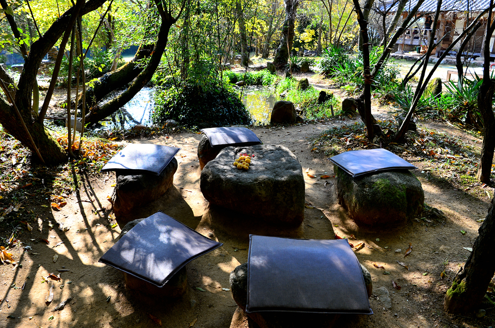 정원의 한쪽에 자그마한 연못이 만들어져 있고, 연못 옆 나무 그늘 아래에는 쉬어갈 수 있는 돌의자도 마련되어 있다.