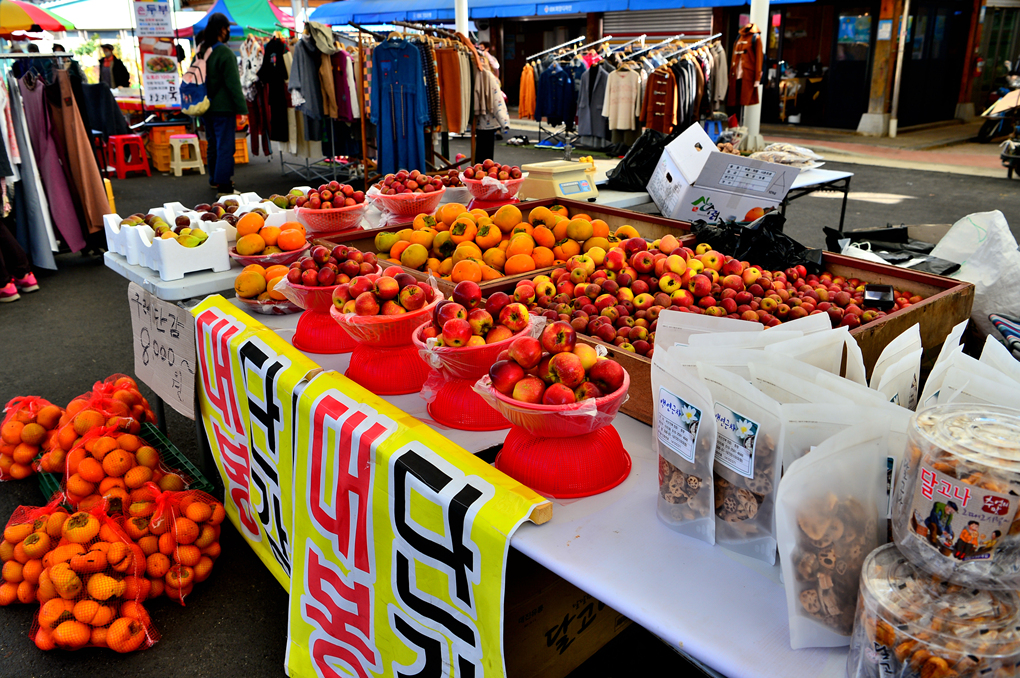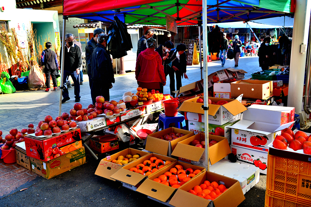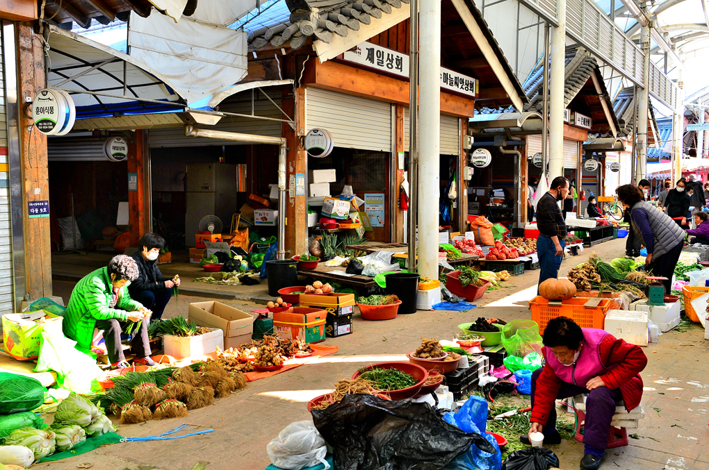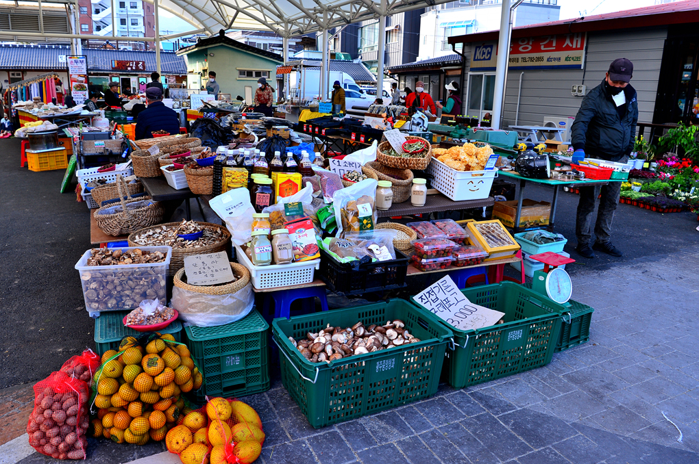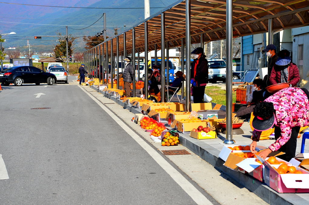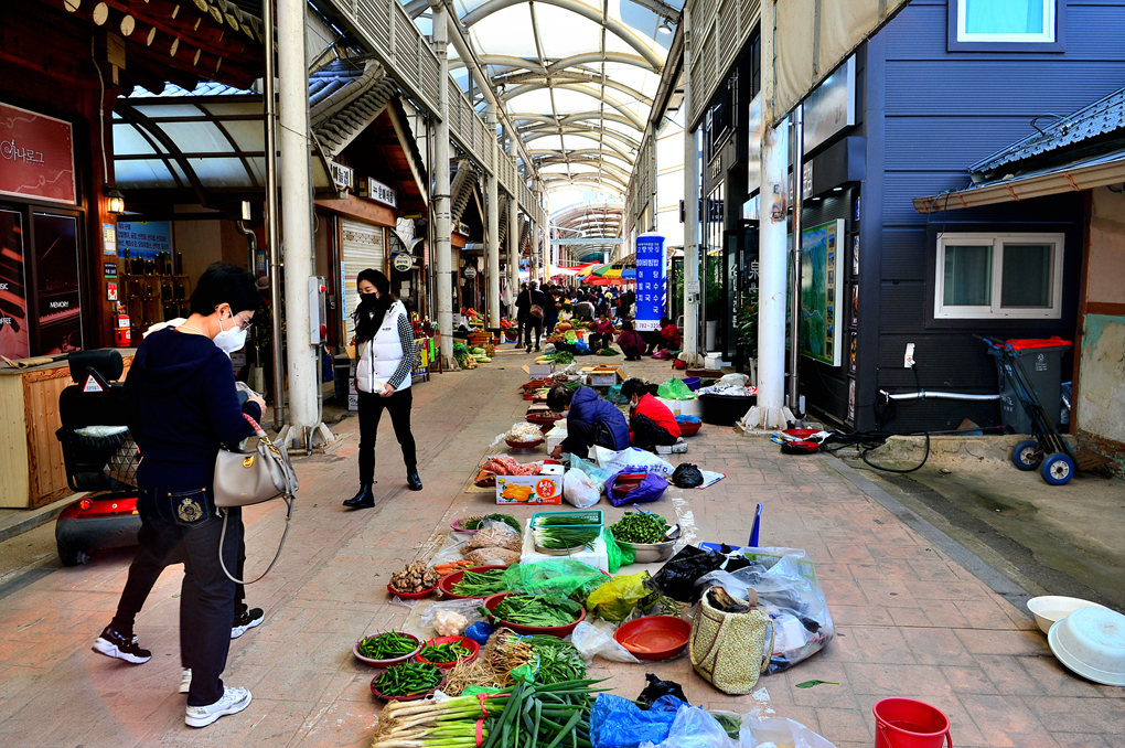 각자 생산한 농산물을 바닥에 펼쳐 놓고 손님을 기다리고 있는 아주머니들 모습이 잊고 살았던 옛 추억을 상기시켜 준다.