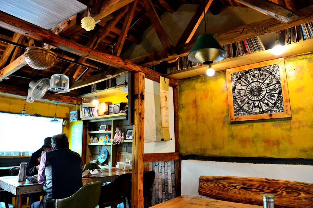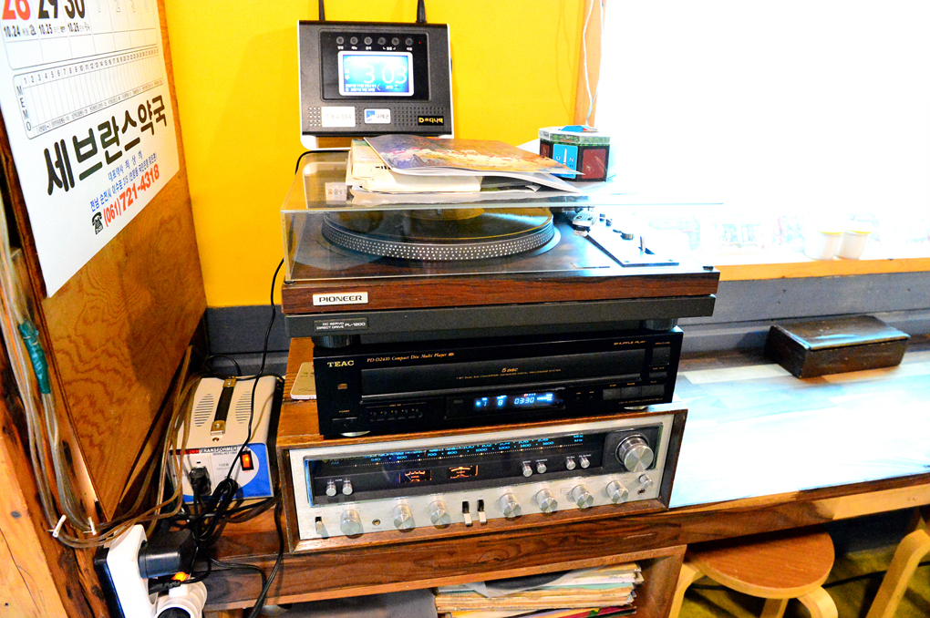 식당 입구 한쪽 구석에 자리 잡고 있는 올드한 턴테이블과 앰프가 그 시절의 향수를 자아낸다.