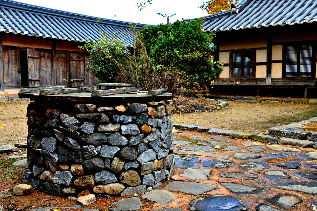 마당 한가운데 있는 돌로 쌓은 우물 모습이다.