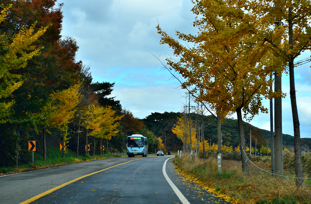은행나무 가로수가 늘어선 조용한 시골길이 운치 있다.