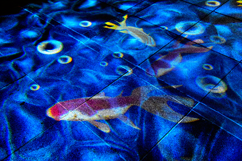시계탑 아래의 보도 블록까지 물고기가 올라와 있다.