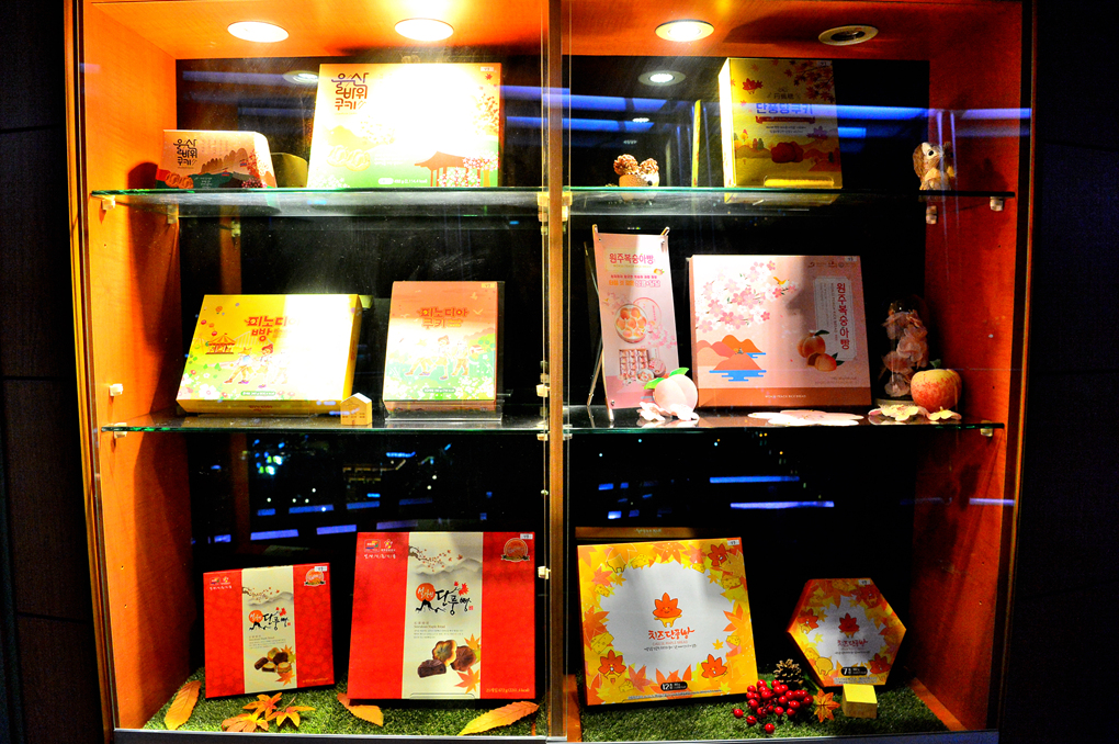 울산바위 쿠키, 단풍당 쿠키, 미노피아 쿠키, 원주 복숭아 빵 등 지역 상품을 소개하는 자그마한 전시장도 보인다.