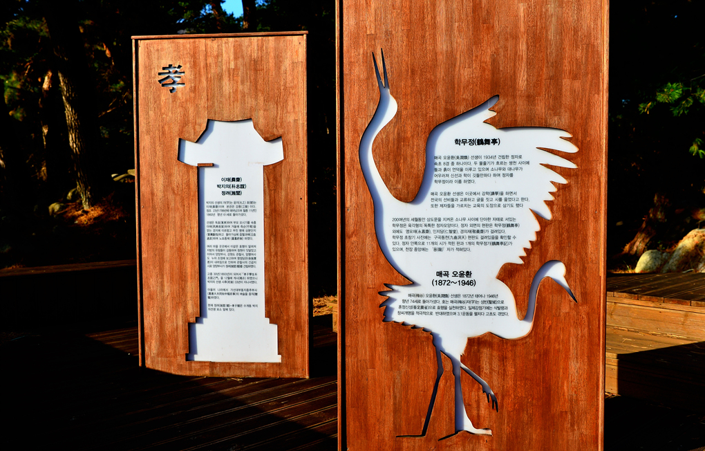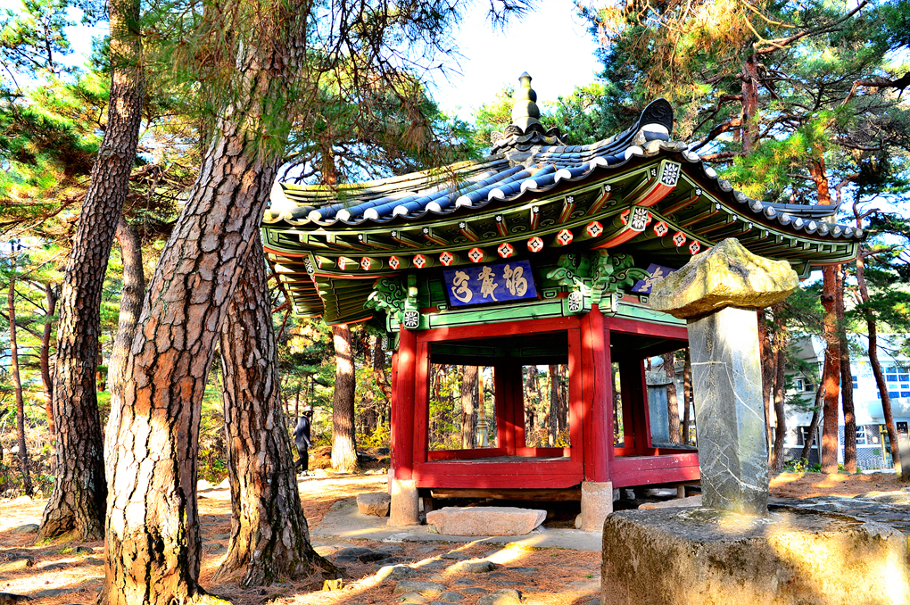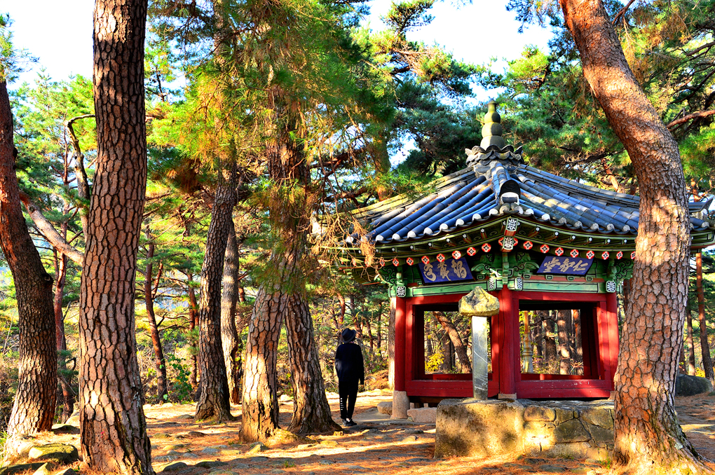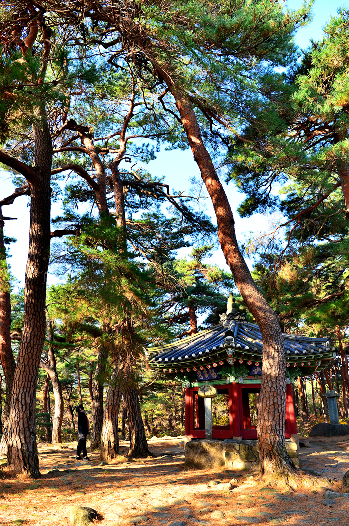 아름다운 소나무 숲에 둘러싸여 있는 학무정 모습이다.