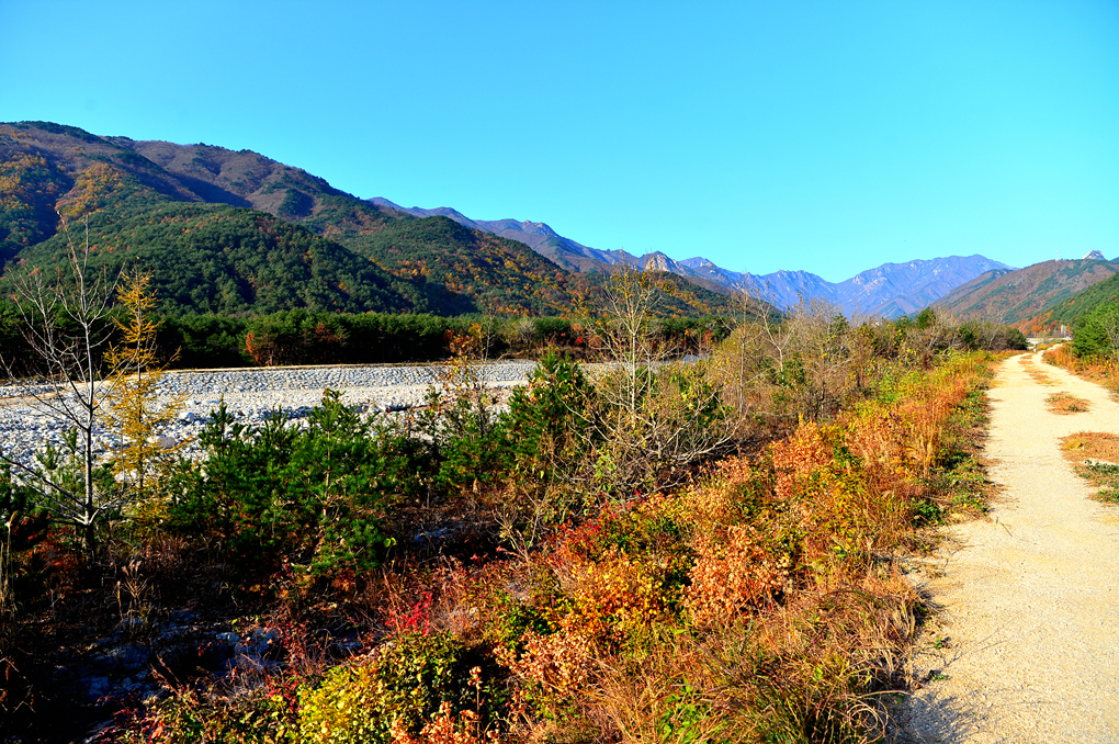 설악동 깊숙이 이어지는 계곡과 둑방길이 나 있다.