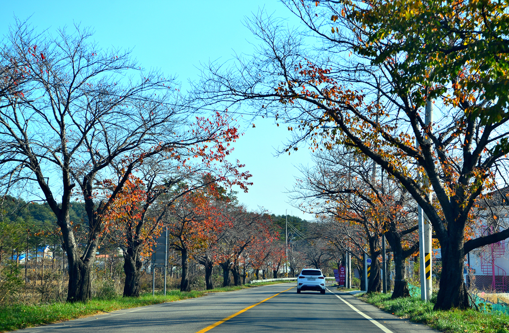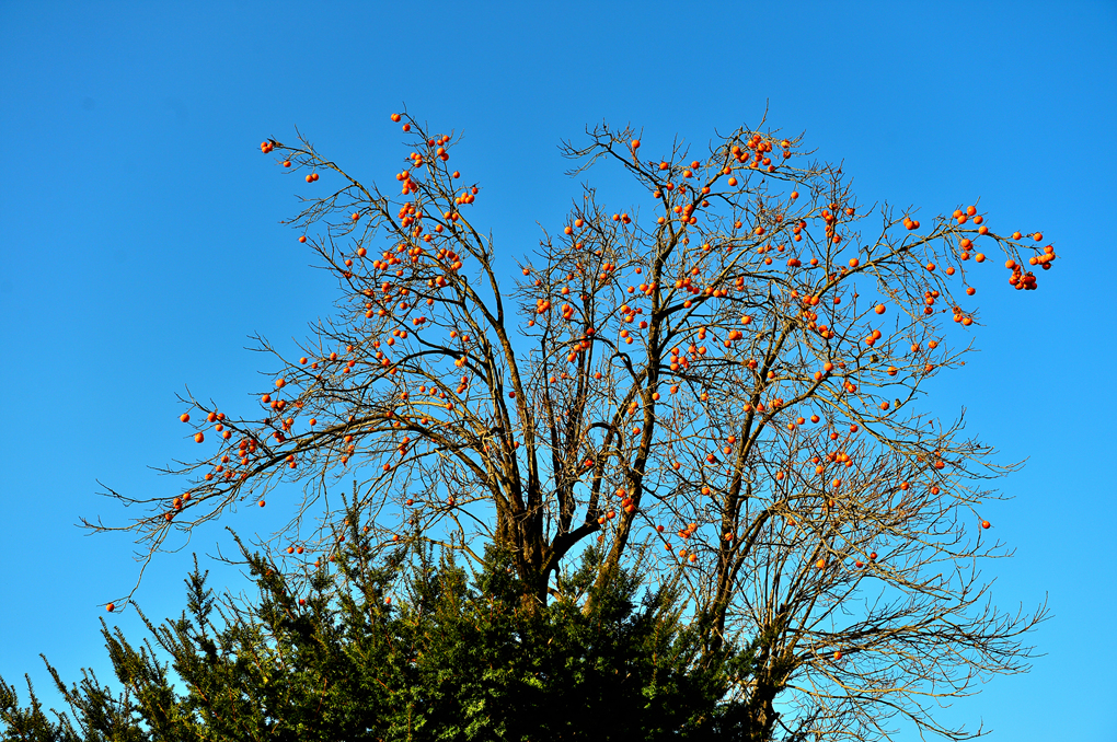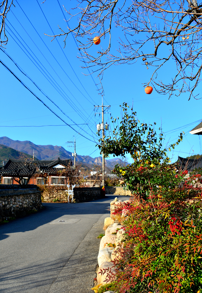 잎사귀를 모두 떨군 앙상한 가지에 주렁주렁 매달린 감들이 가을 정취를 물씬 느끼게 해 준다.