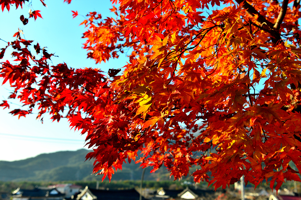호텔 앞 빨간 단풍나무는 여전히 붉게 타오르고 있다.