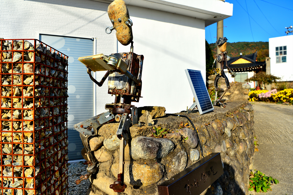 마을을 들어서서 만난 돌담 위의 조형물이다.