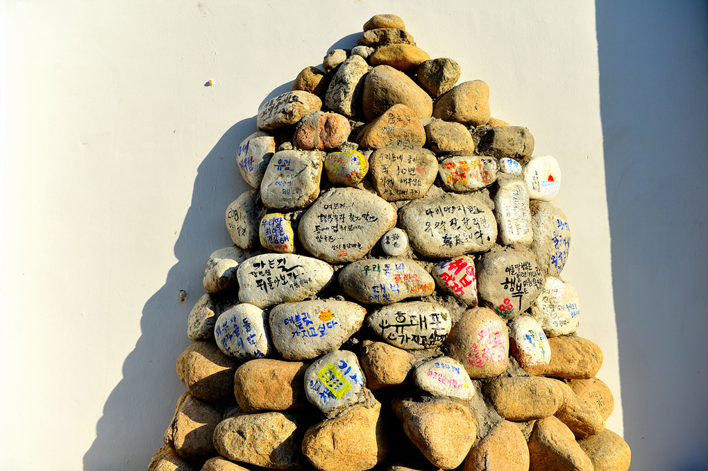 건물 외벽의 돌무더기 위에 다양한 사연이 적혀 있다.