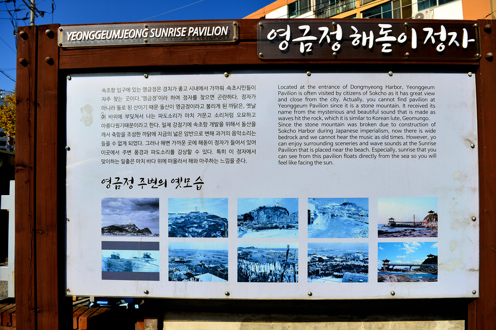 이 정자는 영금정 바위 위에 세워진 해상 정자로 50m 정도의 다리를 건너 들어갈 수 있는데, 속초시에서 영금정 일대를