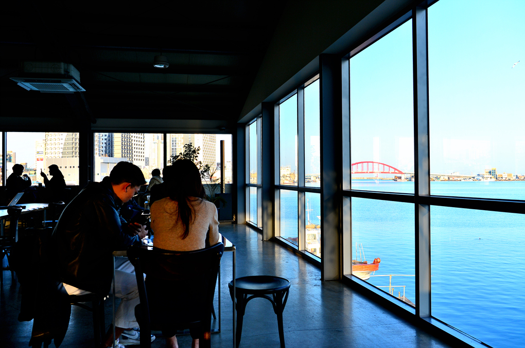 카페 창밖으로 청초호 건너편의 엑스포 상징탑도 보인다.
