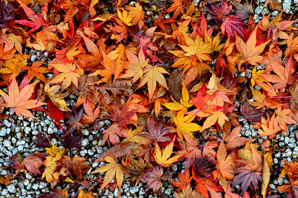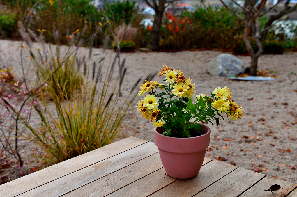 카페 뜰에 휘날리는 낙엽과 작은 화분에 담긴 소담스러운 국화가 떠나가는 가을을 아쉬워하는 듯하다.