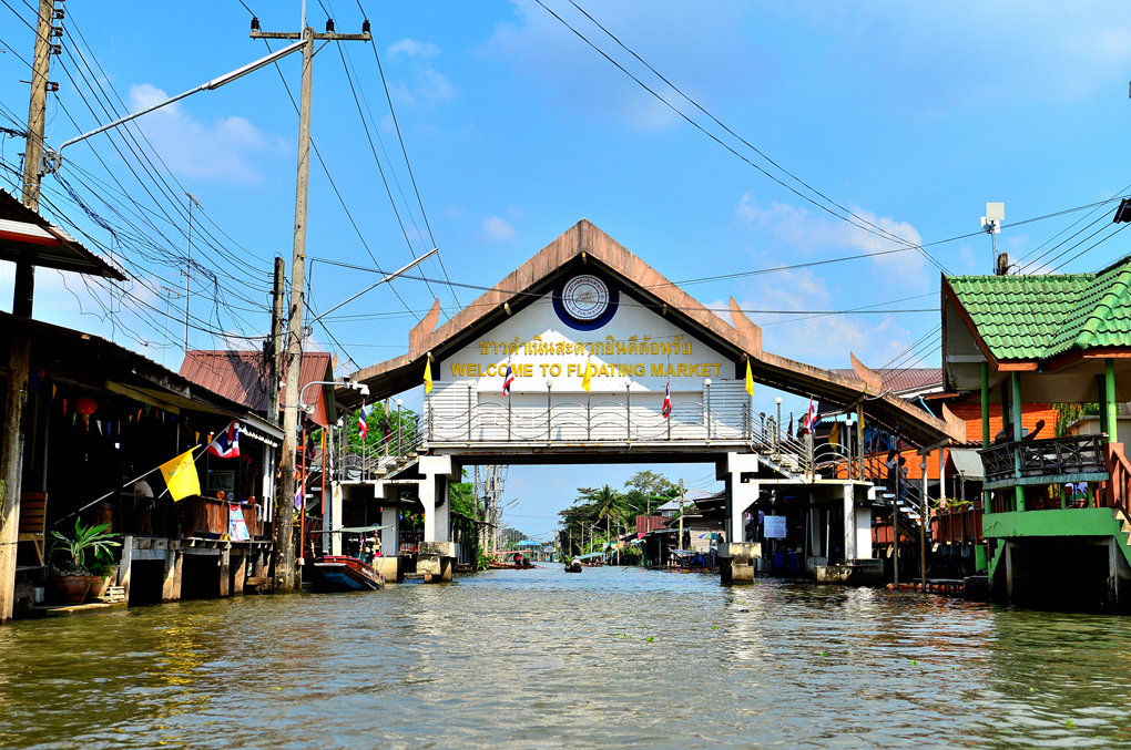 수로 중앙에 가로놓인 건물에 Welcome to Floating Market이라는 글귀가 쓰여 있다.