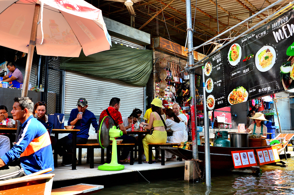 수로 옆 음식점에서 다양한 현지 음식을 즐기는 관광객들 모습도 보인다.