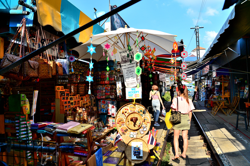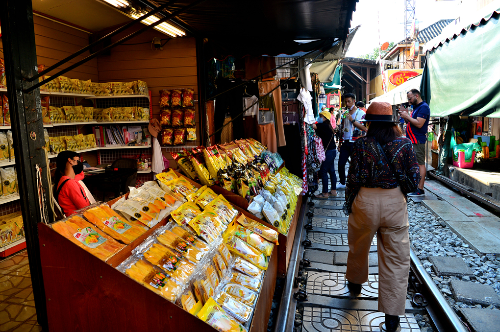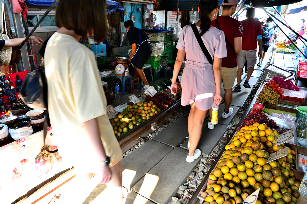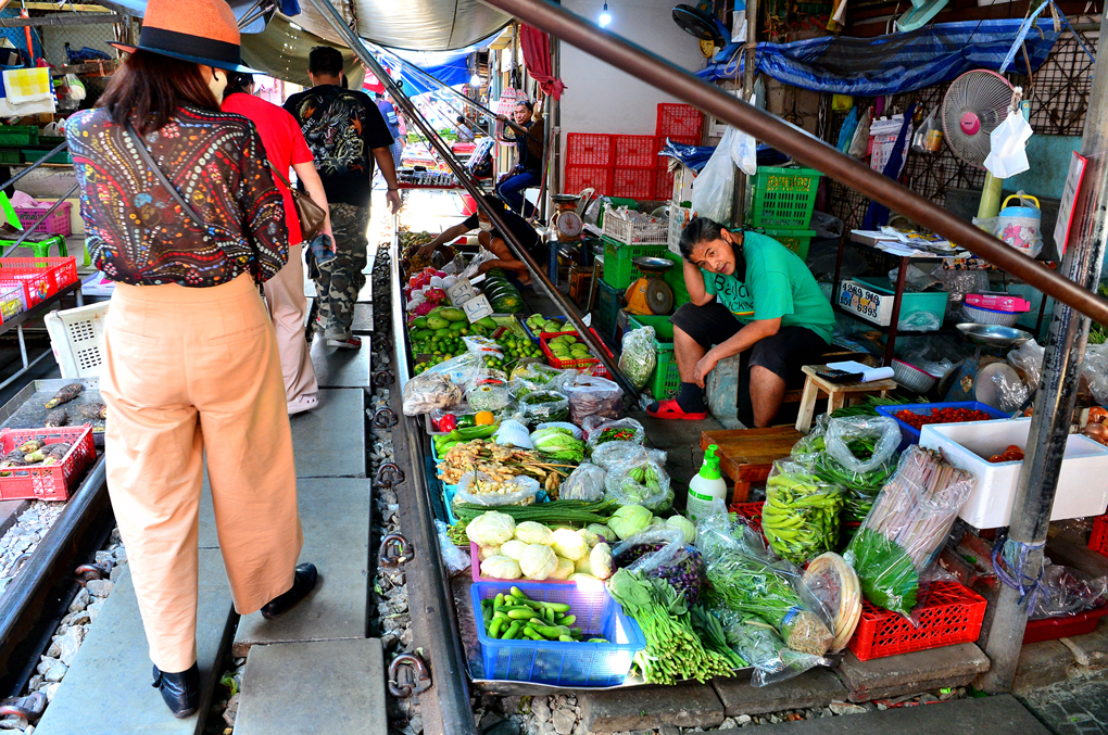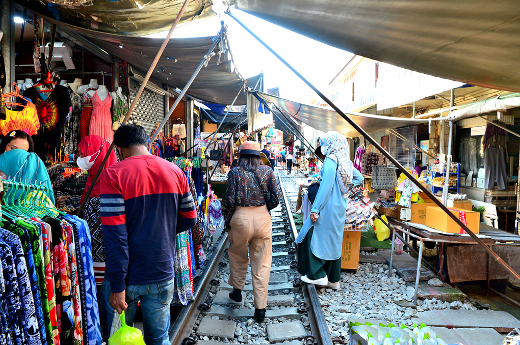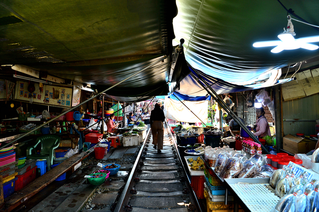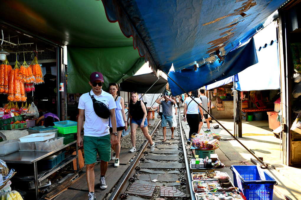 이곳은 방콕 서쪽 싸뭇 쏭크람 Samut Songkhram 지역에 위치한 시장으로, 시장을 가로질러 기차가 다니는 독특한 시장이