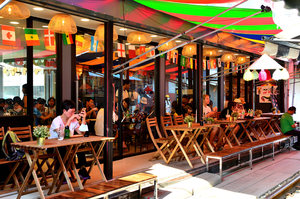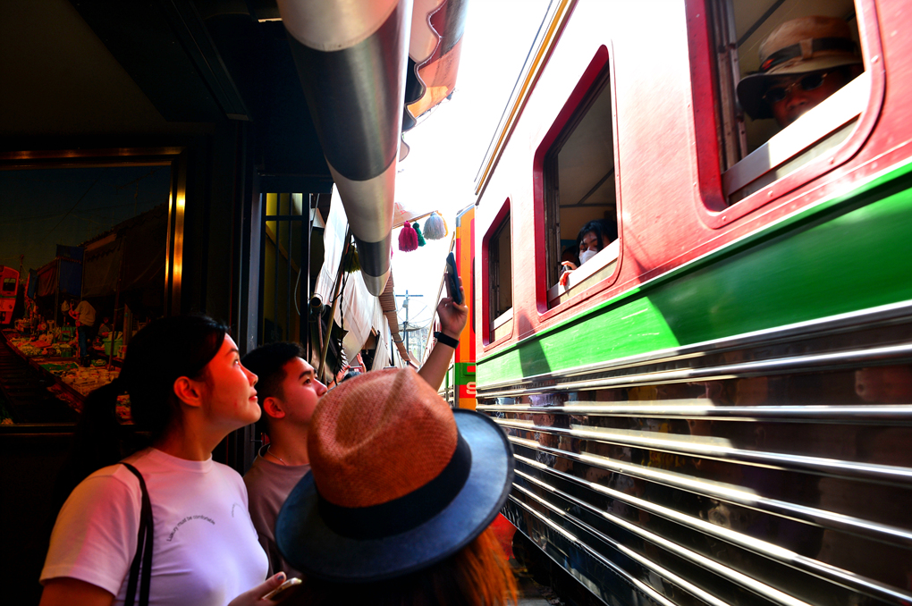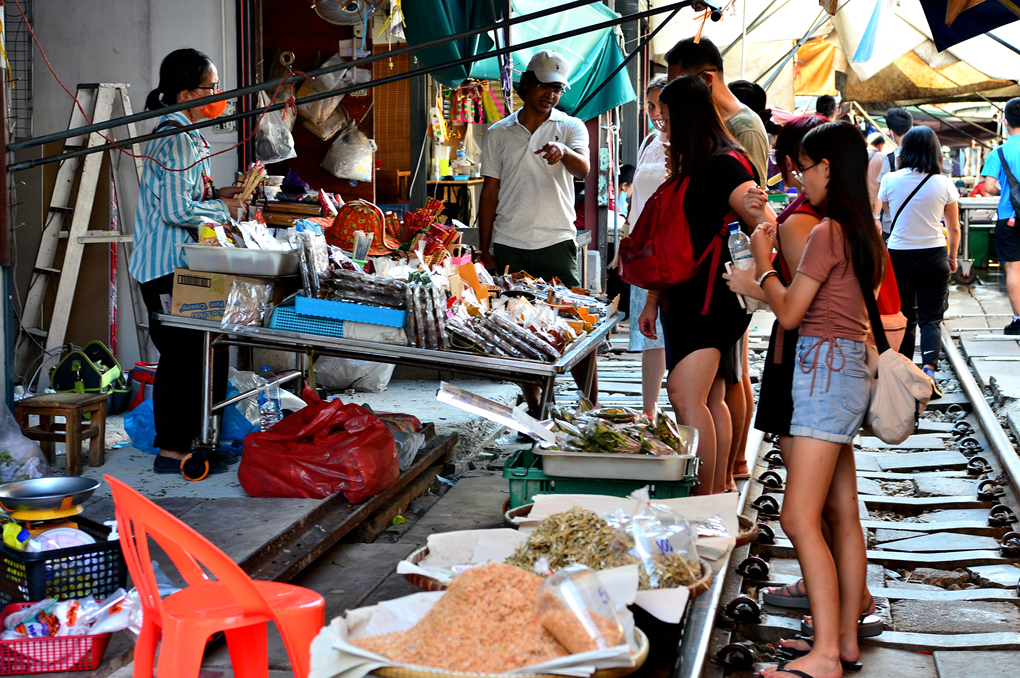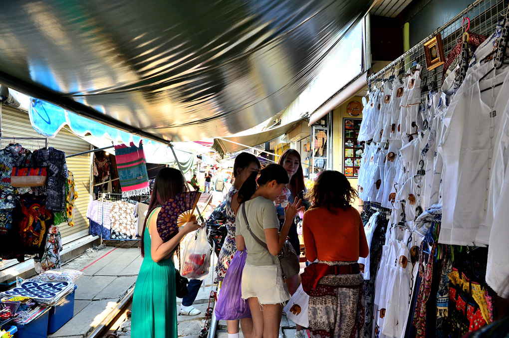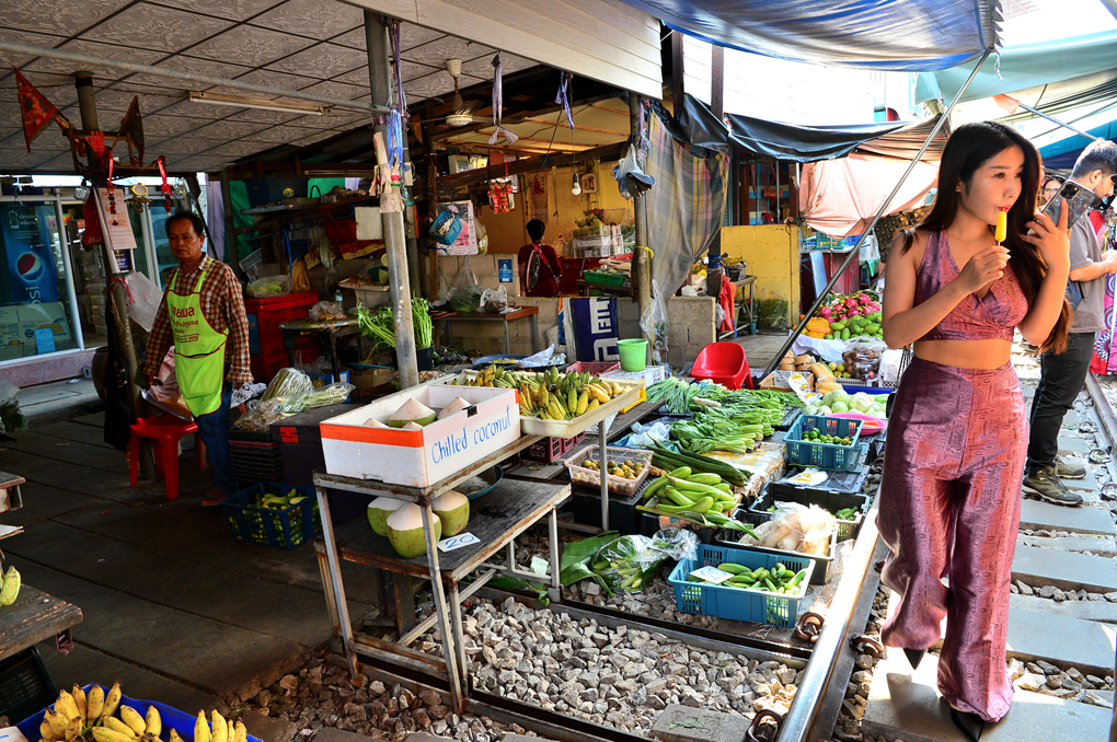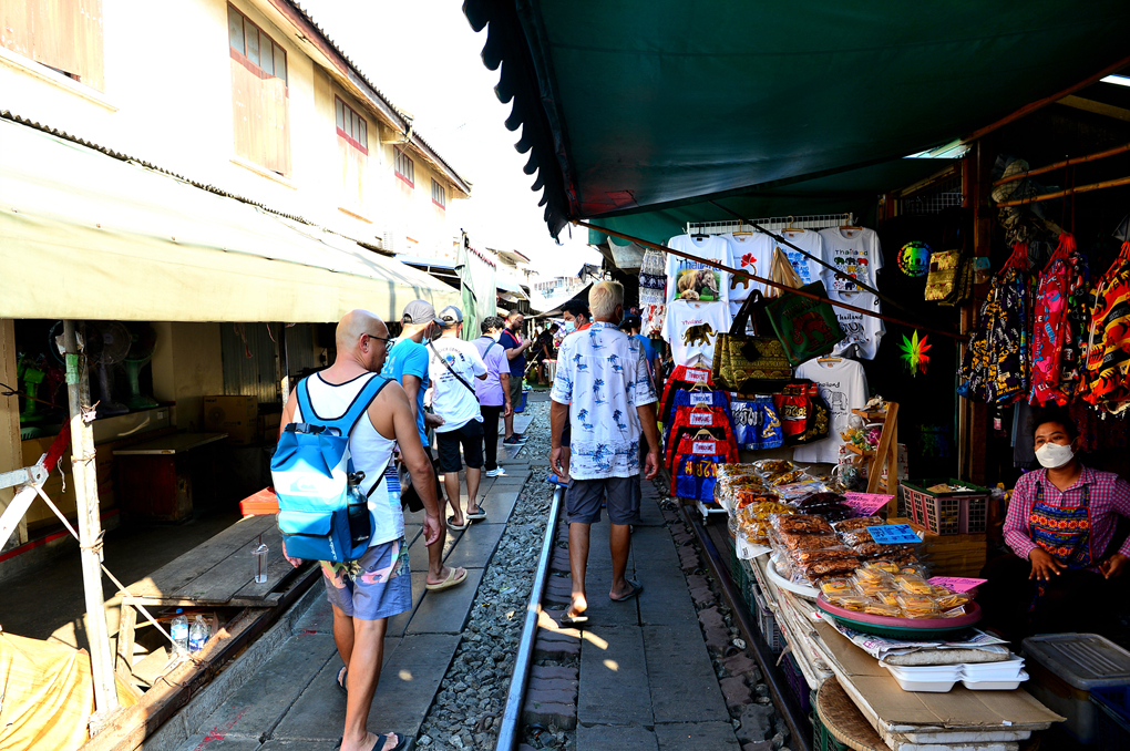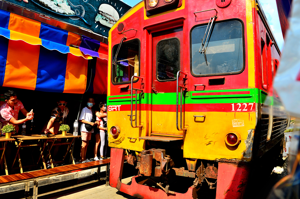 이곳은 방콕 서쪽 싸뭇 쏭크람 Samut Songkhram 지역에 위치한 시장으로, 시장을 가로질러 기차가 다니는 독특한 시장이