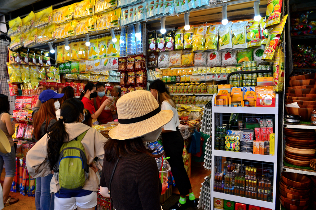열대 과일 말린 것들에 많은 관광객들의 시선이 쏠려 있다.