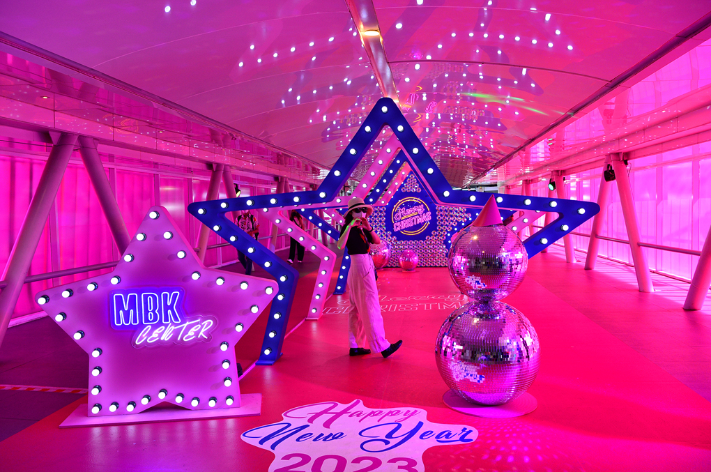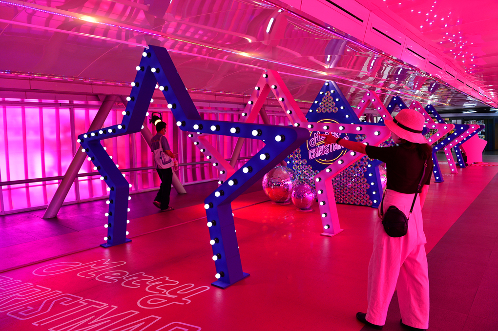 도로 반대편에서 마분콩으로 이어지는 구름다리를 핑크빛으로 독특하게 장식해 놓아서 사진을 찍어 보았는데~