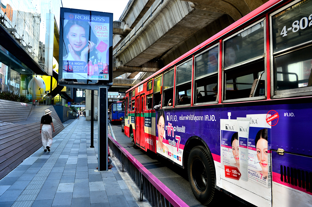 도로를 지나는 차량과 그 위의 BTS가 다니는 육중한 콘크리트 구조물, 도로 옆 화려한 외관의 쇼핑몰들이 묘한 대조를