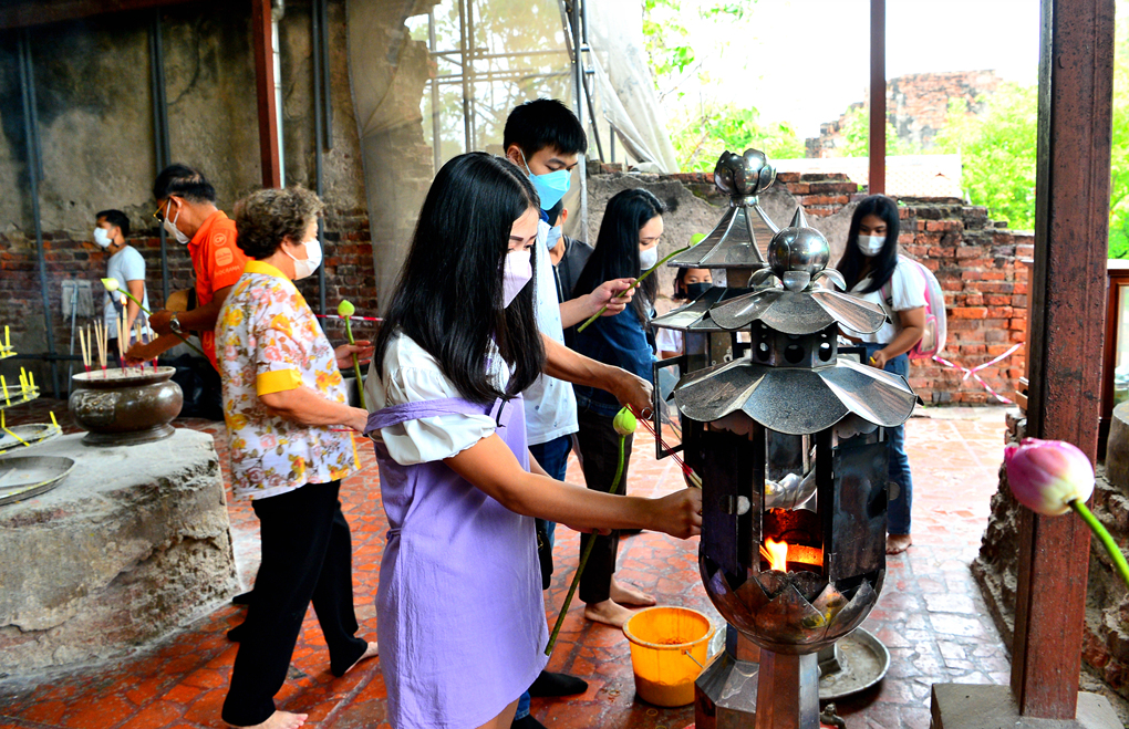 법당 입구의 많은 현지인들이 꽃을 들고 향을 피우는 등 공양에 여념이 없다.
