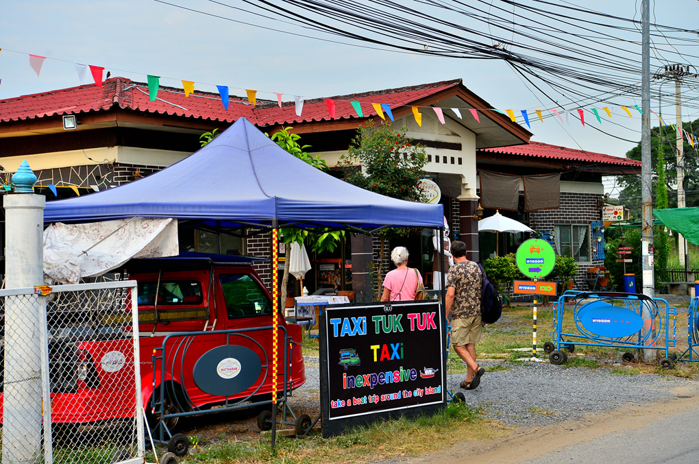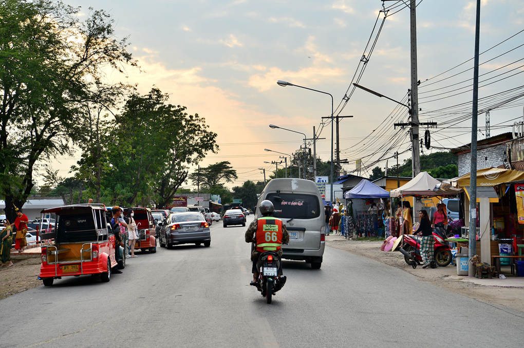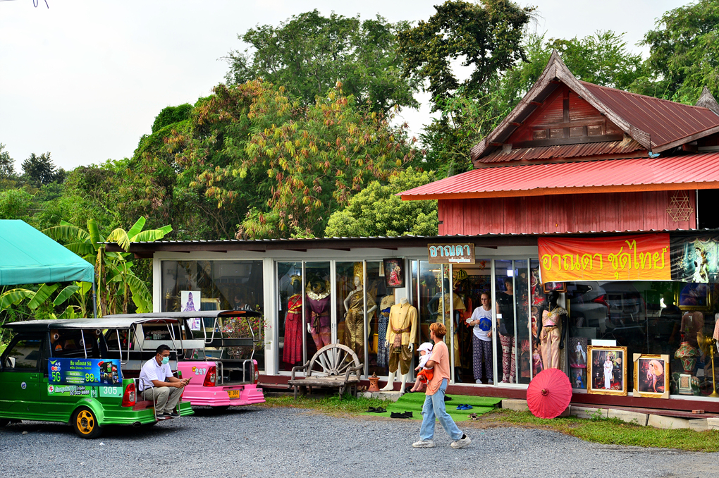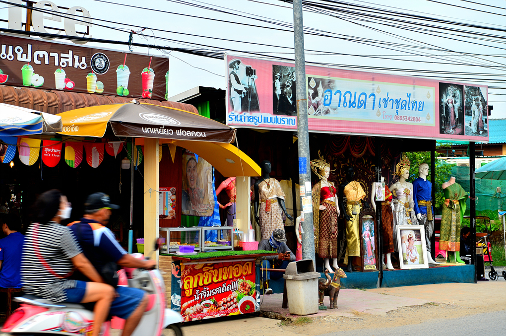 사원 앞 도로변 모습인데 태국 전통 의상을 대여해 주는 상점들이 줄지어 있다.