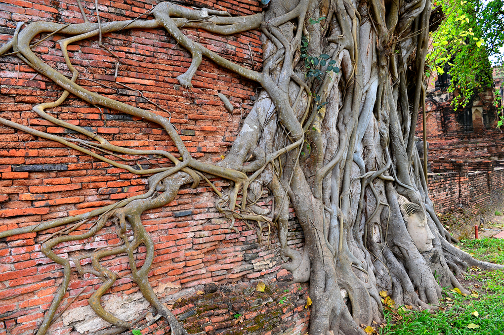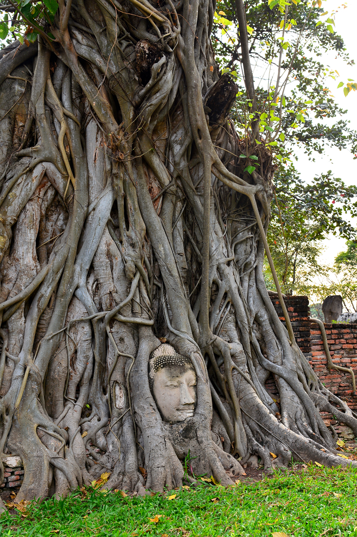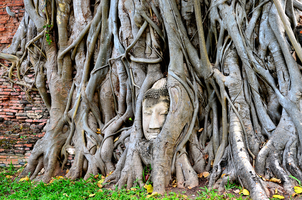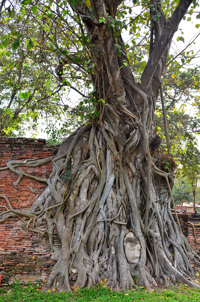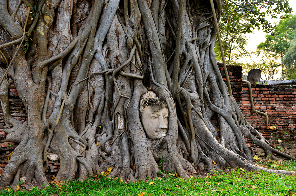 보리수 뿌리에 휘감긴 불상의 표정이 평온해 보인다.