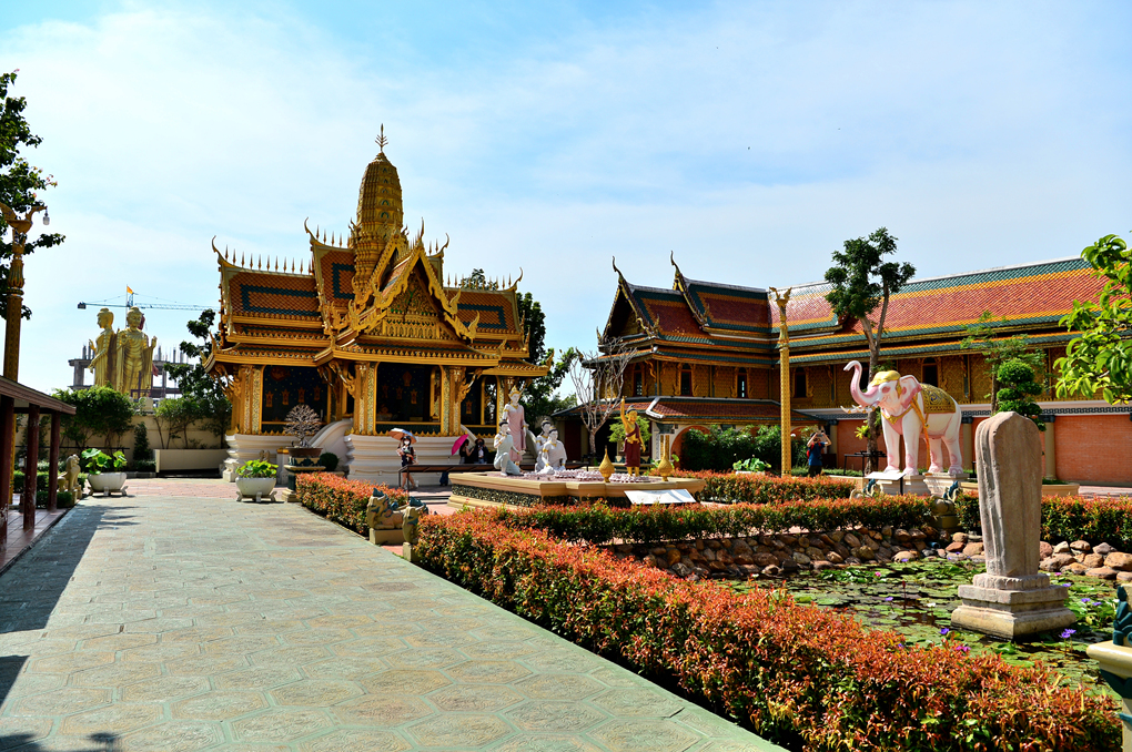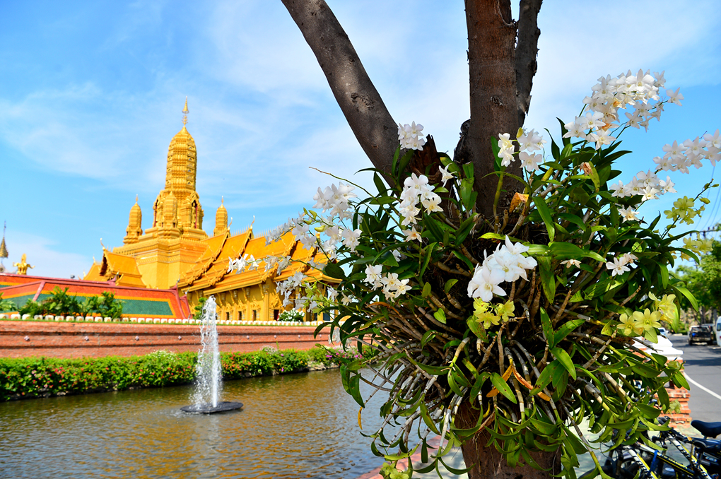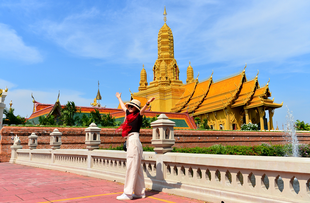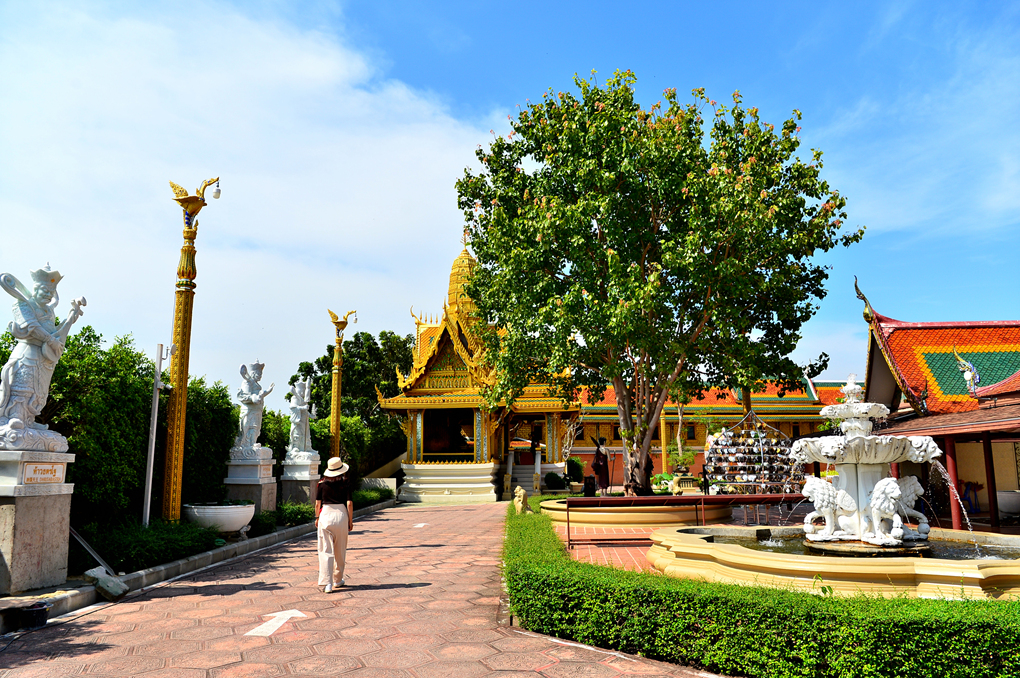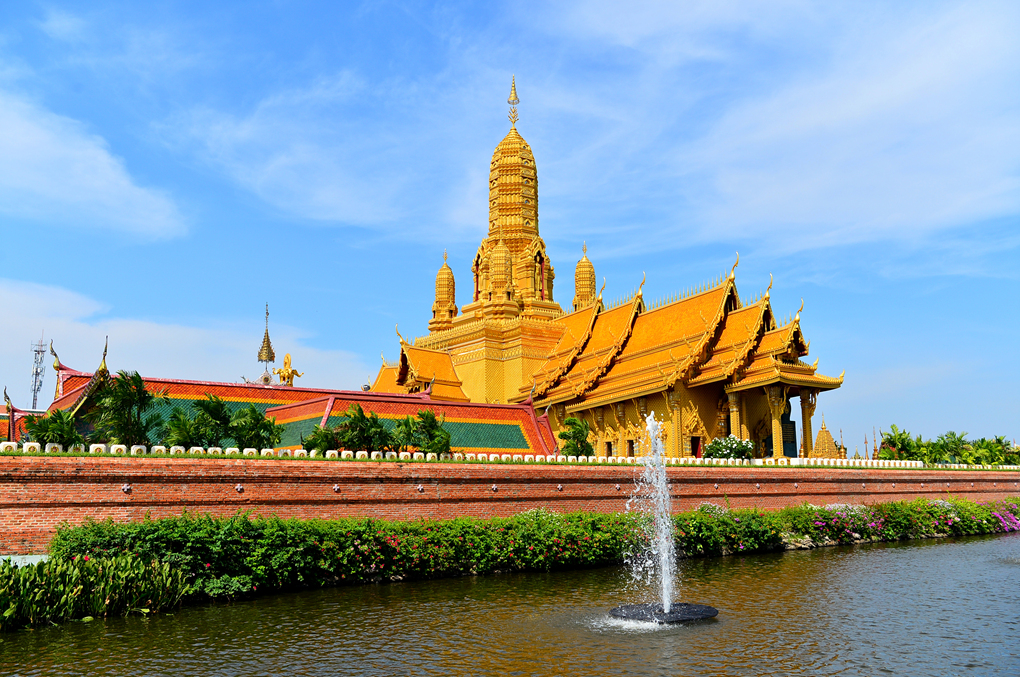 무앙보란 Muang Boran 유적지와 경계 짓는 수로 너머로 황금빛 사원이 보인다.