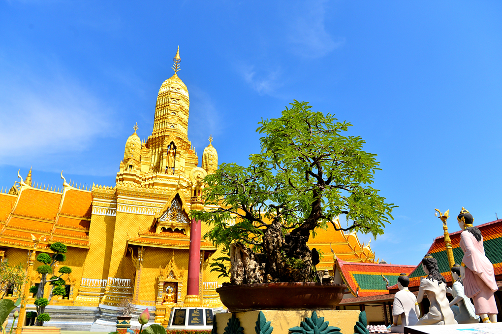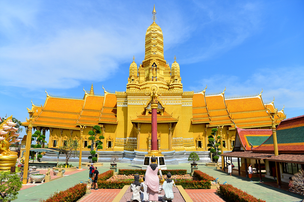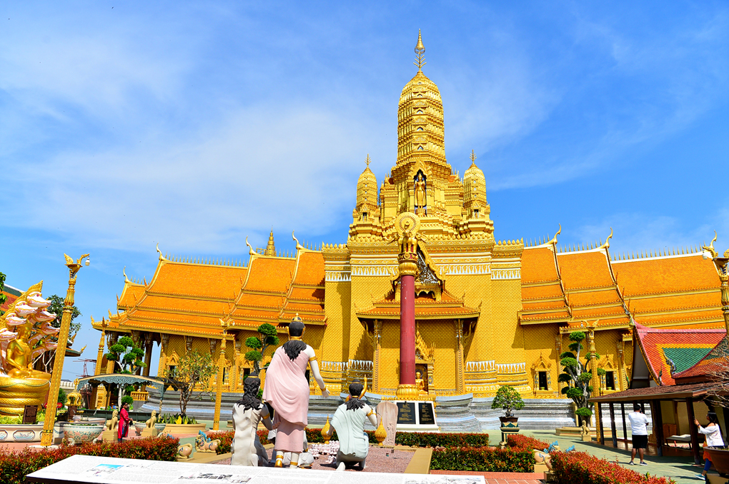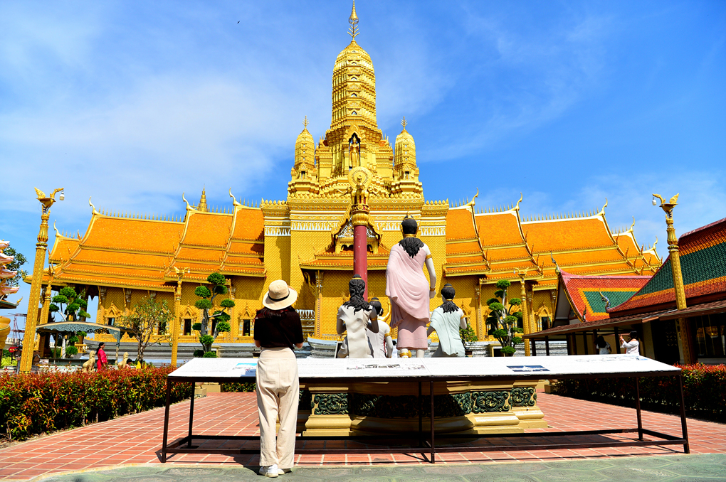 무앙보란 Muang Boran 유적지와 경계 짓는 수로 너머로 황금빛 사원이 보인다.