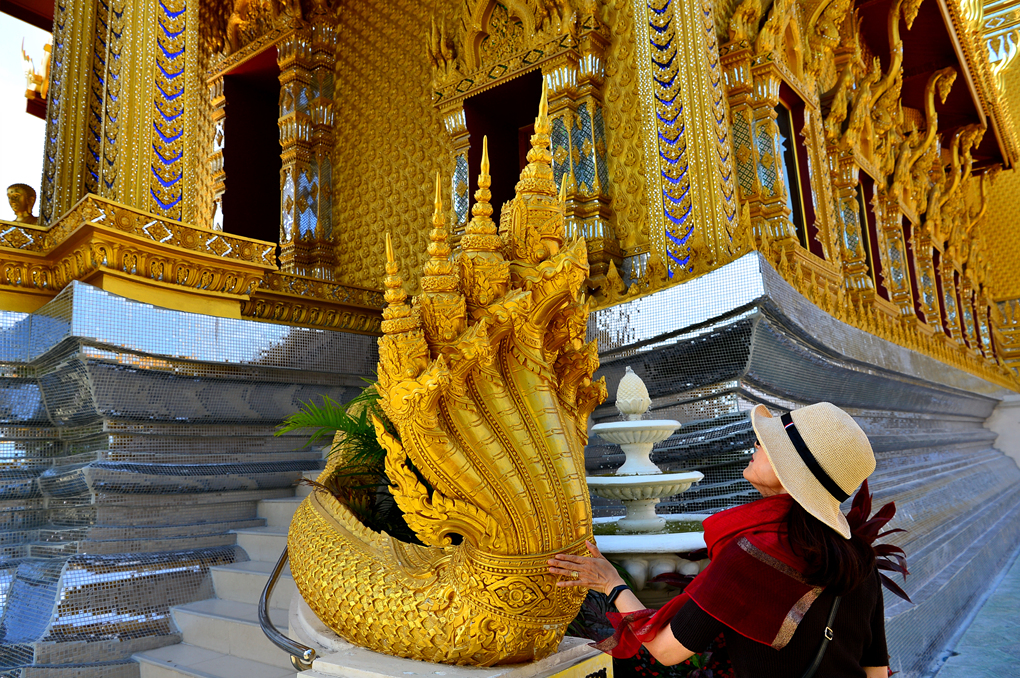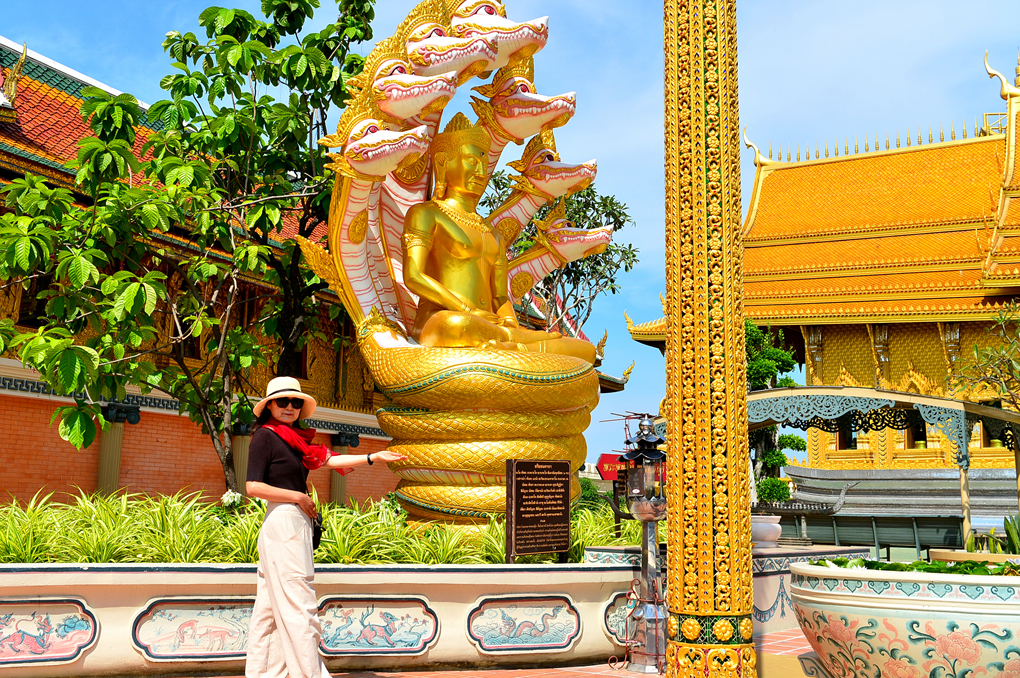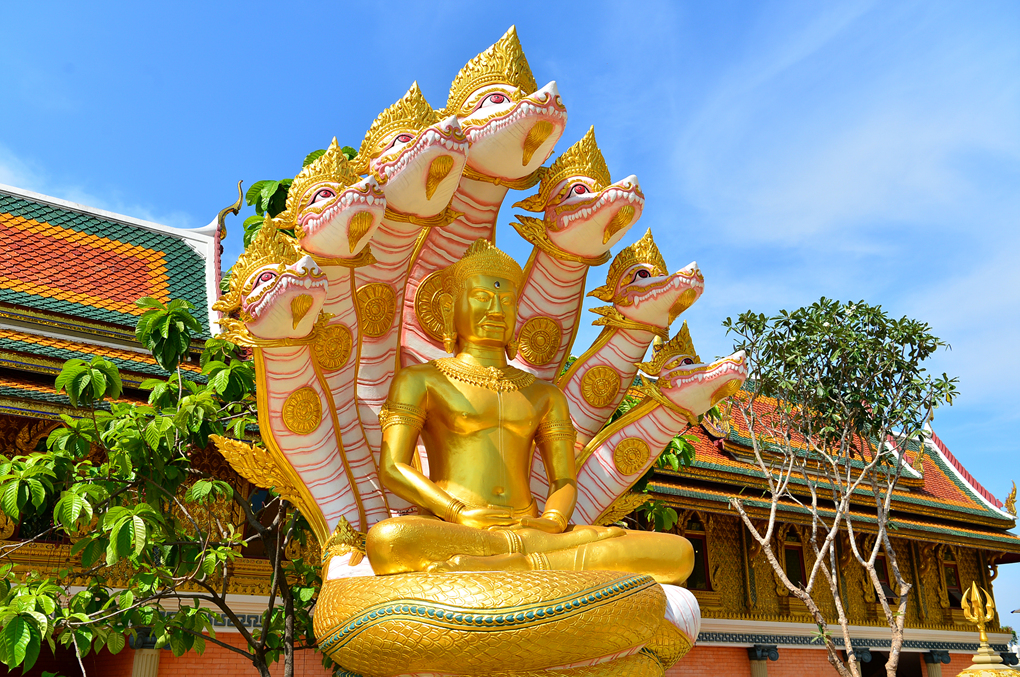 동남아 불교 국가들에서 흔히 볼 수 있는 불상과 장식 모습인데, 뱀의 몸통 위 머리가 특이하다.