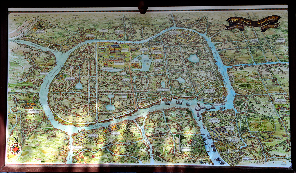 도시를 감싸고도는 짜오프라야 강과 도시를 잘게 구획하고 있는 듯한 수로들로 이루어진 아유타야의 옛 모습을 잘 표현해