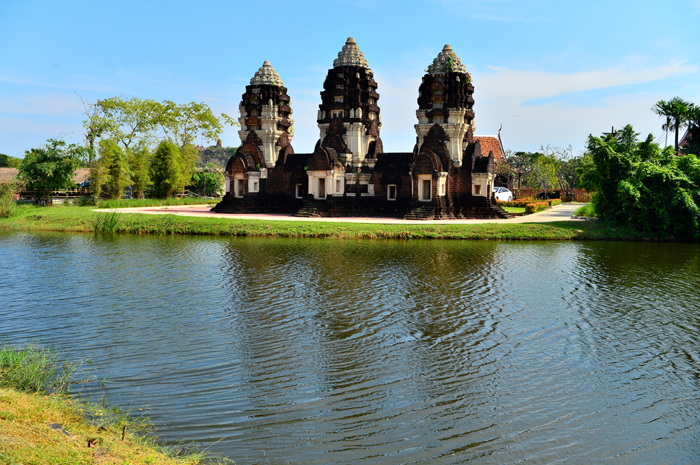Phra Prang Yod Kloem Mafuang 수로 건너편에 서있는 단정하게 생긴 세 탑이다.