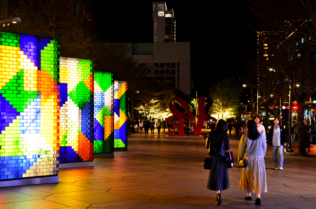 블록 형태의 조형물에 불이 들어와 있는데 이곳에서 기념촬영을~?