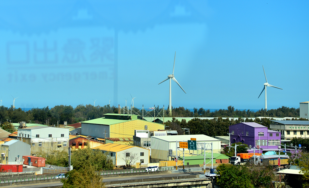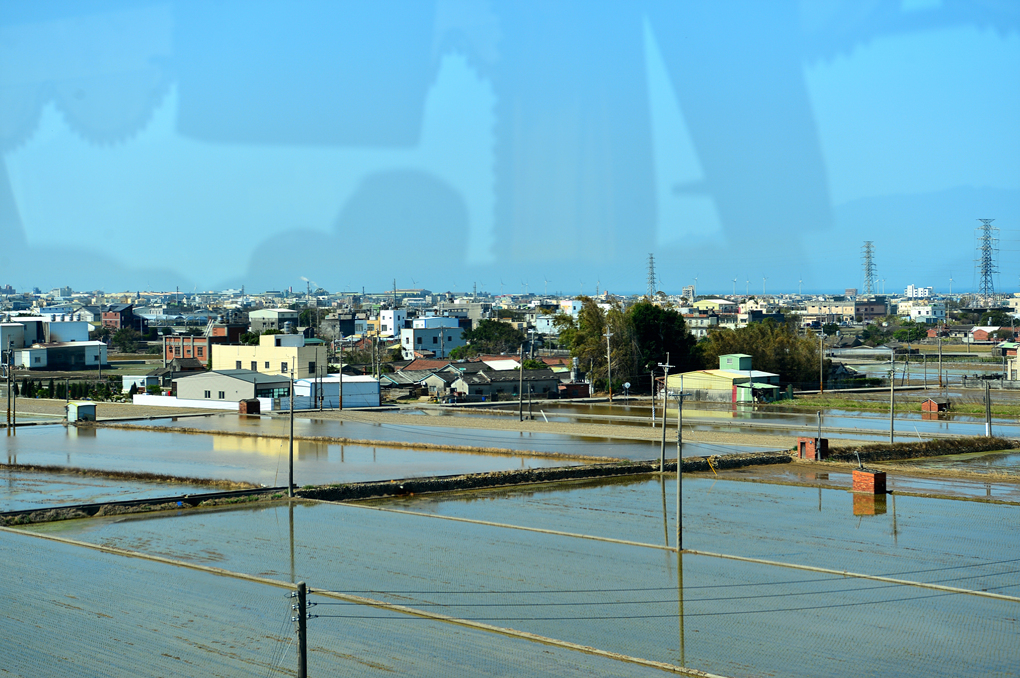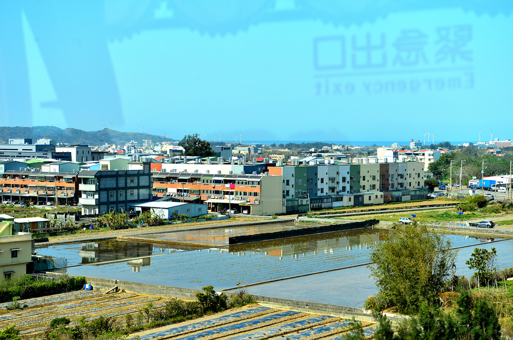 논물이 가득한 논과 건물들 뒤로 푸른 수평선과 함께 풍력 발전기가 보인다.