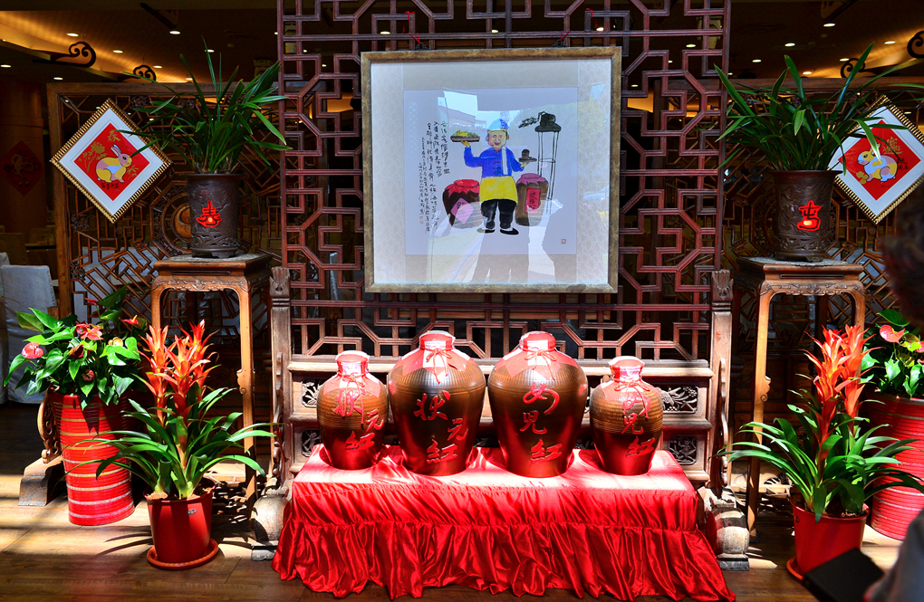 맞은편에는 술병들이 진열되어 있는데, 물이 좋아 유명하다는 이곳 푸리의 명물 소홍주인가 보다.