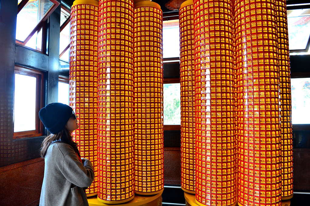 사원 안 한쪽에 세워져 있는 기둥 모양의 긴 원통들~